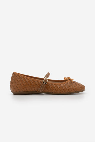 Kadın Küt Burun Fiyonklu Mary Jane Bantlı Örgü Desen Günlük Babet Teyra - Taba