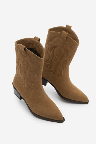 Kadın Sivri Burun Nakışlı Western Bot Nilva - Taba Süet