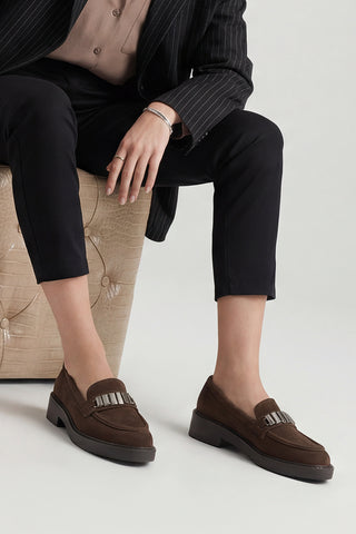 Kadın Hakiki Deri Zincirli Loafer Ayakkabı Tanle - Kahve Süet