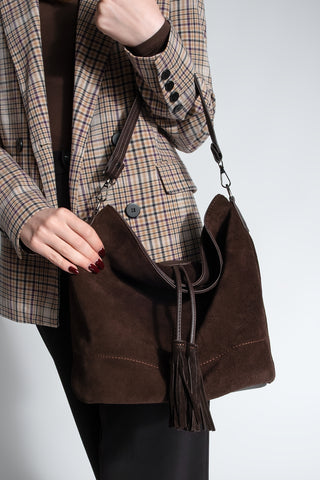 Kadın Hakiki Deri Püsküllü Omuz Çantası Soliga - Kahve Süet