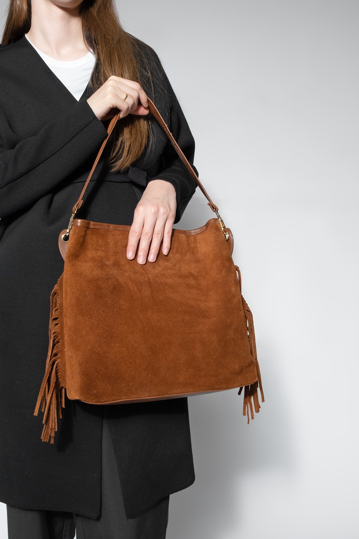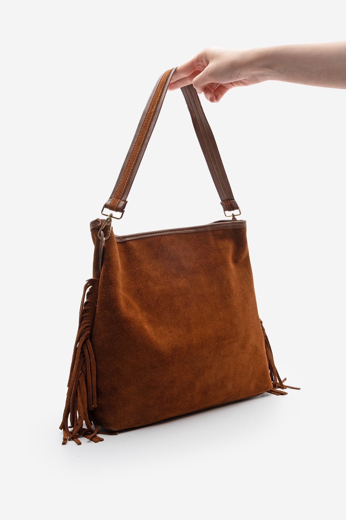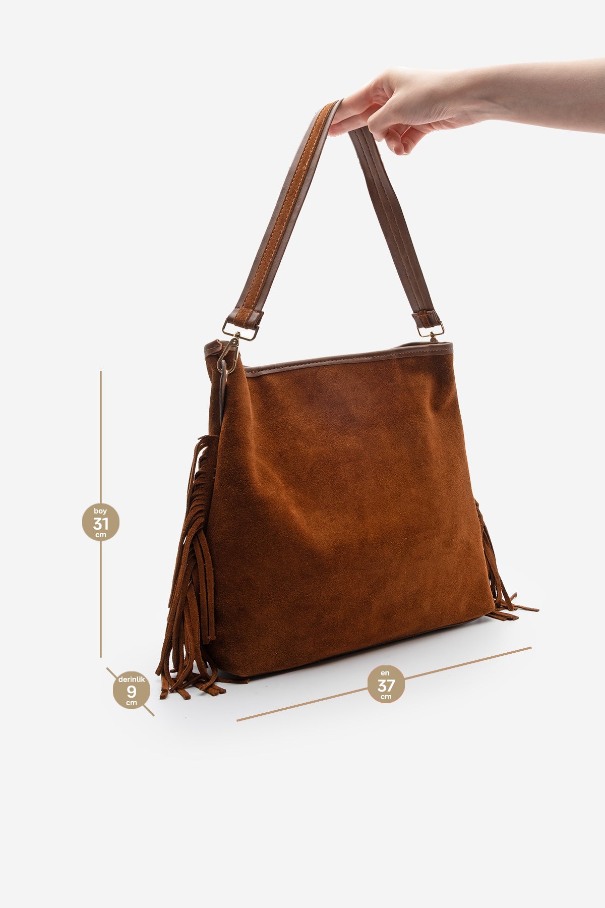 Kadın Hakiki Deri Püsküllü Omuz Çantası Soliga - Taba Süet