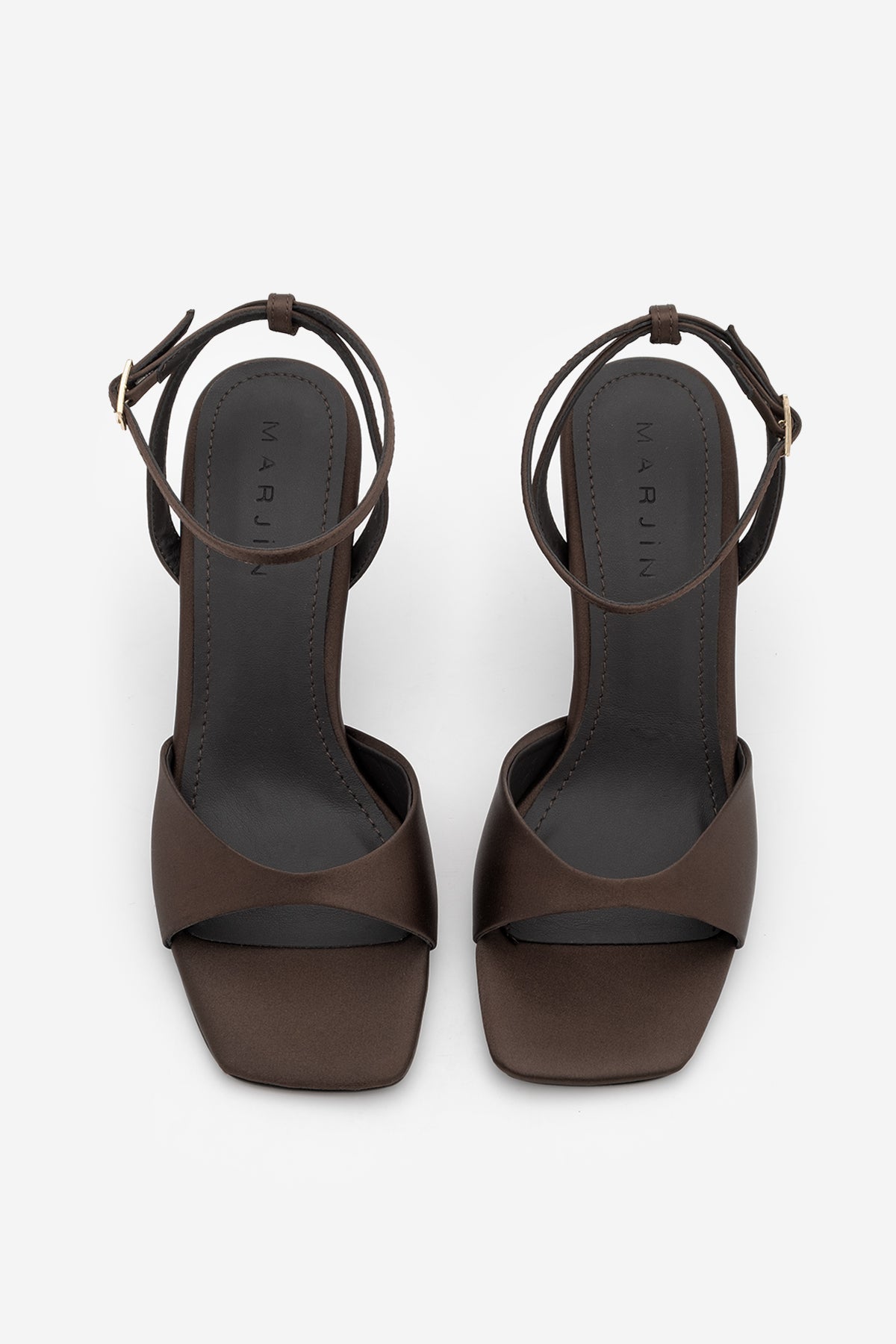 Kadın Küt Burun Topuklu Sandalet Vados - Kahve Saten
