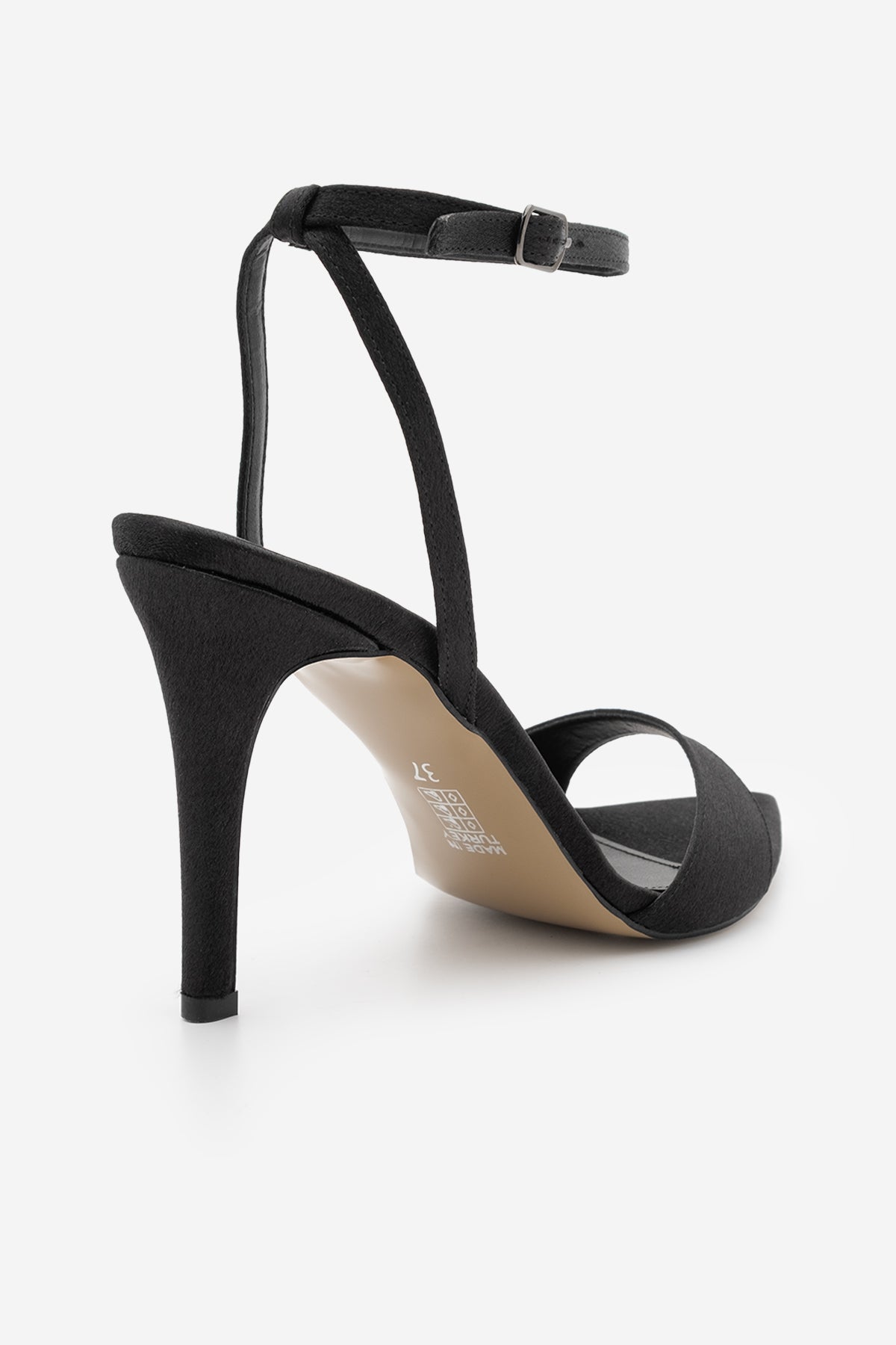 Kadın Sivri Burun Bantlı İnce Topuklu Sandalet Lokes - Siyah Saten