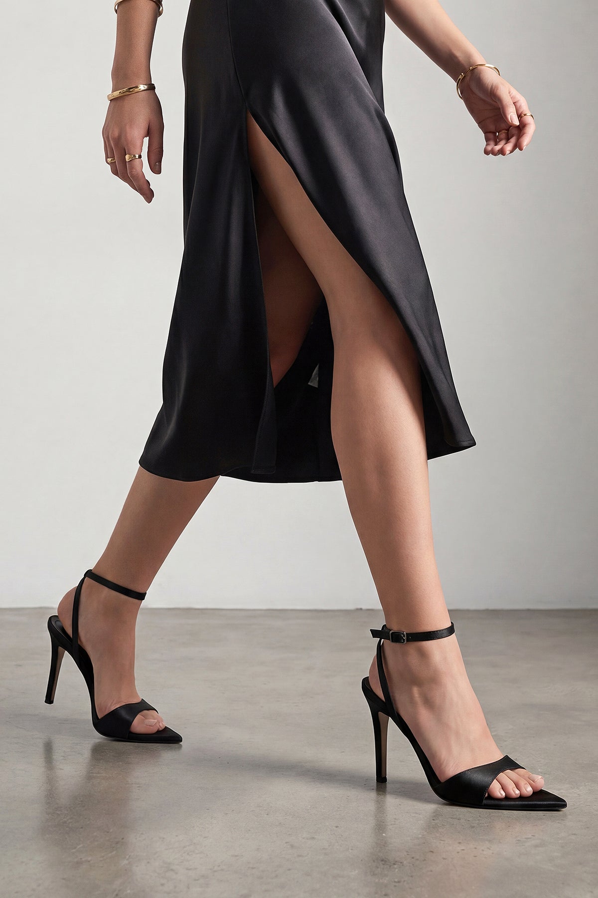 Kadın Oval Burun İnce Topuklu Sandalet Dospin - Siyah Saten