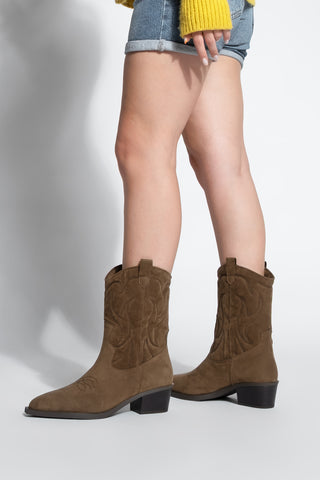 Kadın Sivri Burun Nakışlı Western Bot Nilva - Taba Süet