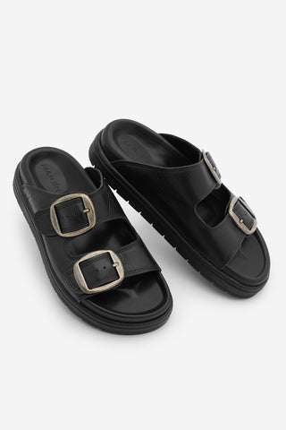 Kadın Hakiki Deri Çift Bantlı Günlük Terlik Dorsin - Siyah