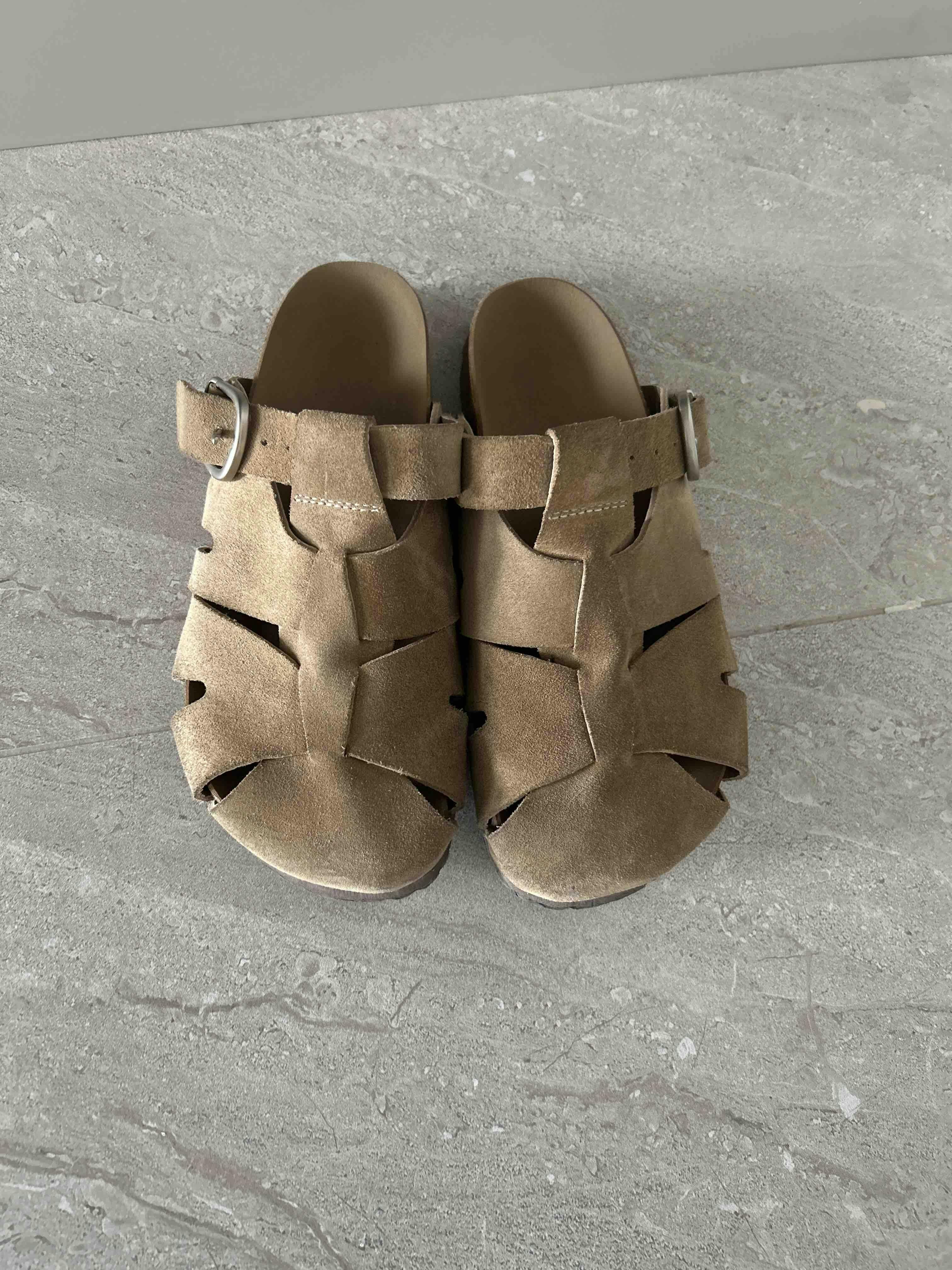Kadın Hakiki Deri Tokalı Süet Terlik Yolis - Toprak Süet