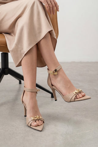 Kadın Sivri Burun Tokalı İnce Topuklu Sandalet Sophira - Bej