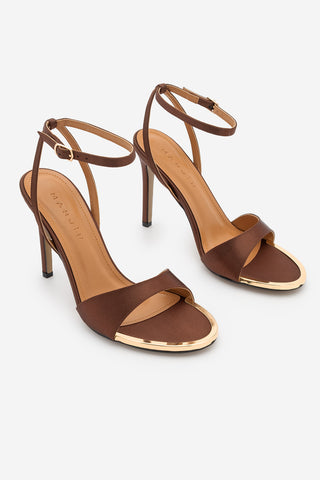 Kadın Sivri Burun Bantlı İnce Topuklu Sandalet Lokes - Kahve Saten