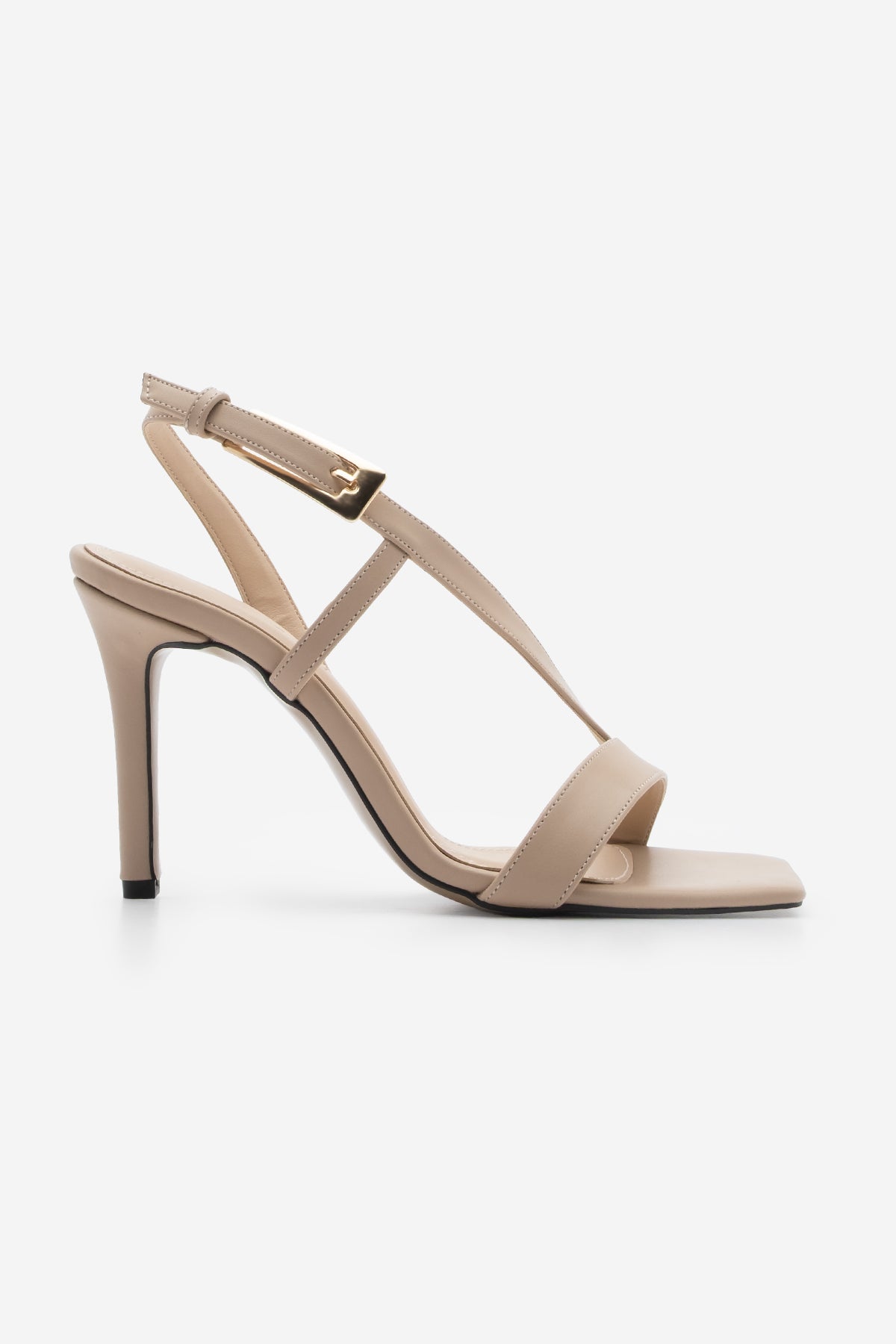 Kadın Küt Burun Tokalı Topuklu Sandalet Vetun - Bej