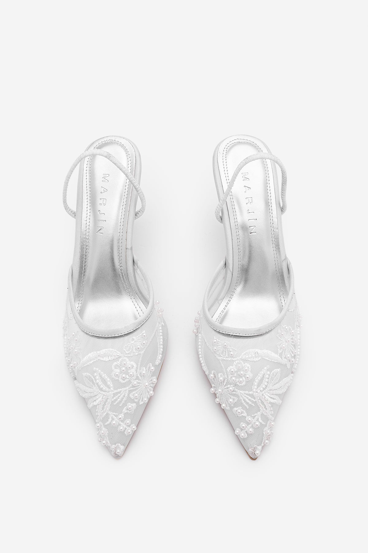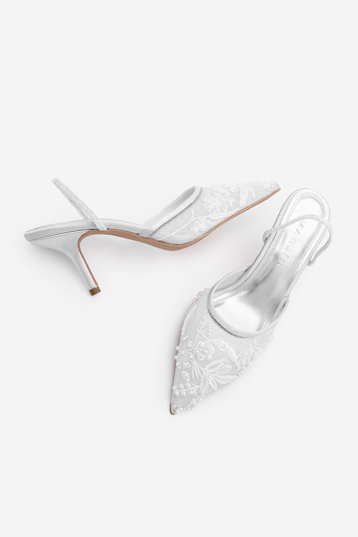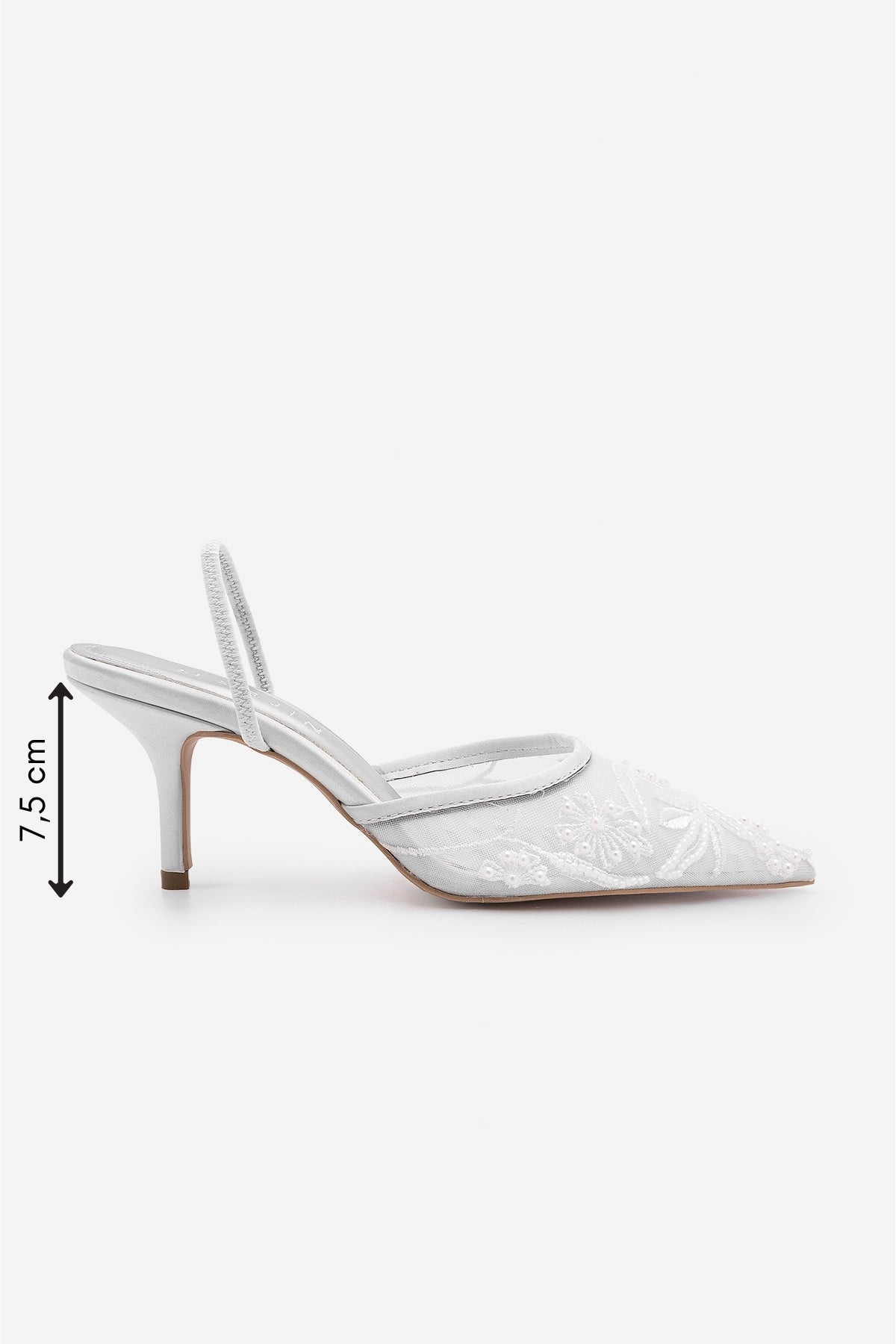 Kadın Stiletto Boncuklu Fileli Nakışlı İşlemeli Klasik Topuklu Ayakkabı Velsedi - Gümüş Saten