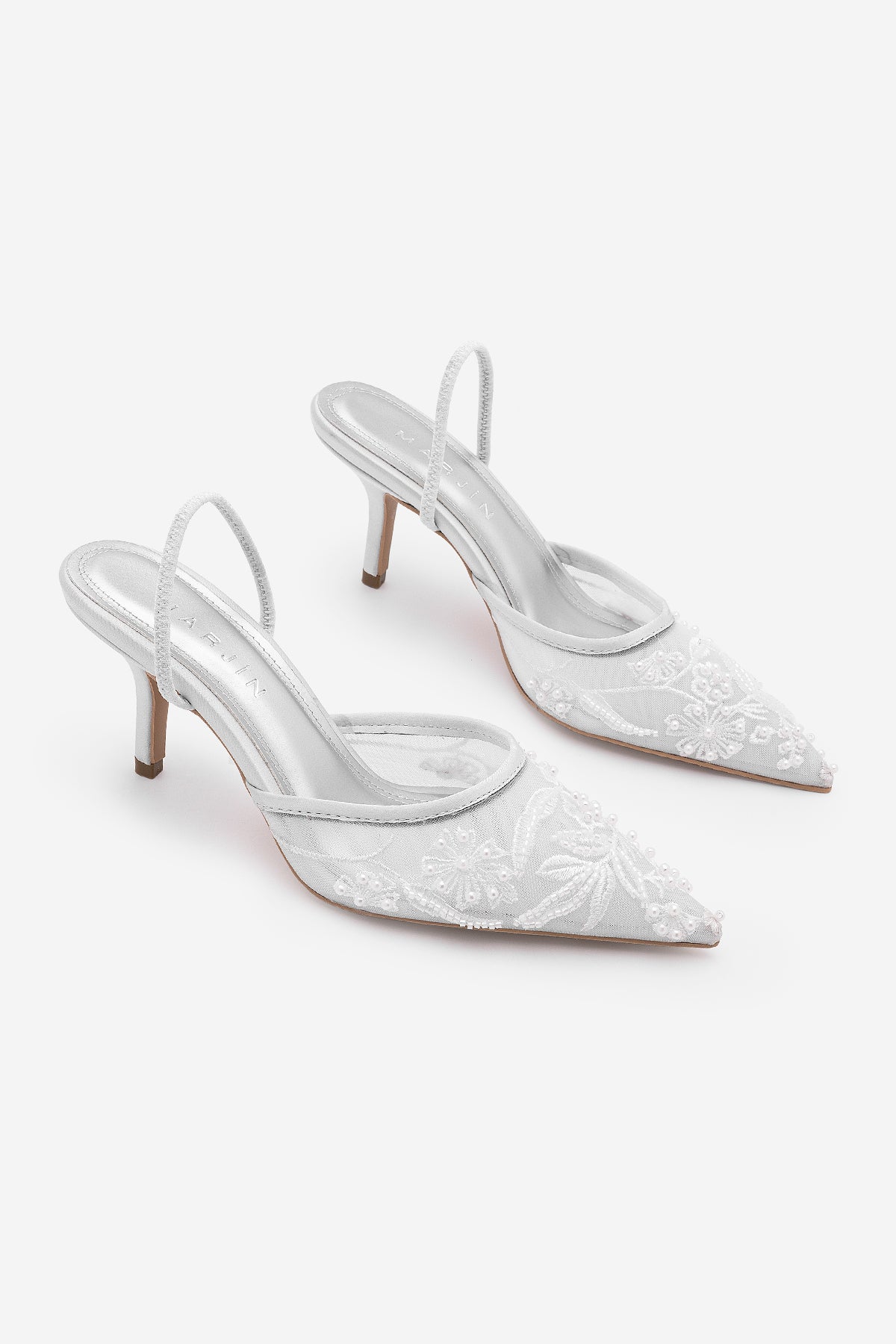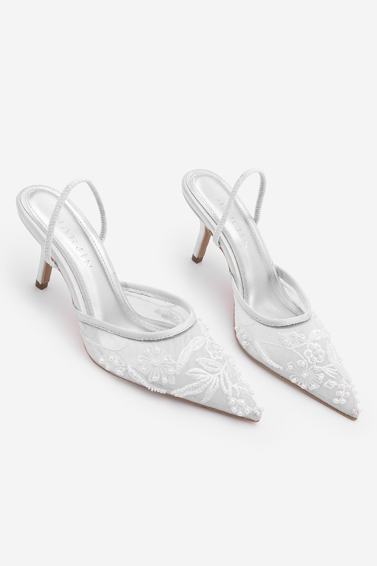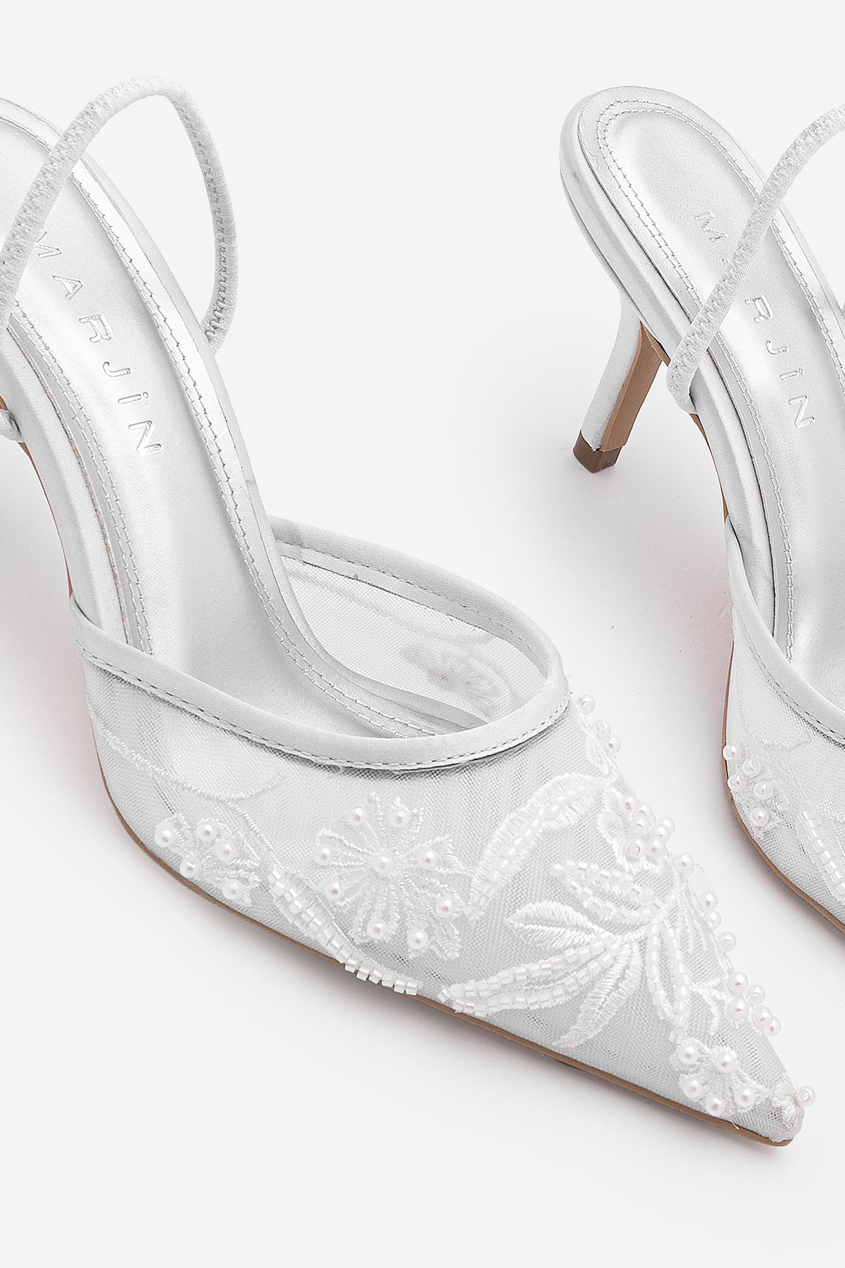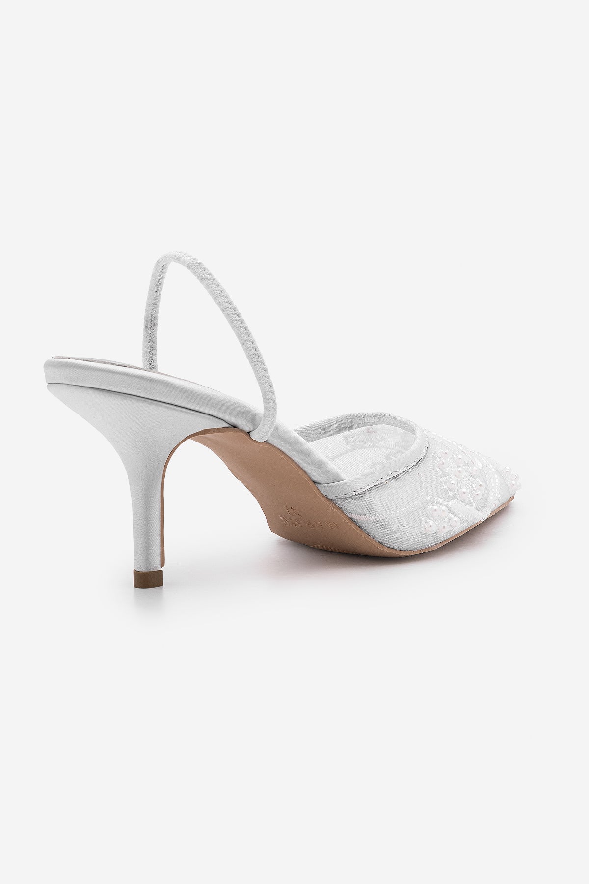 Kadın Stiletto Boncuklu Fileli Nakışlı İşlemeli Klasik Topuklu Ayakkabı Velsedi - Gümüş Saten