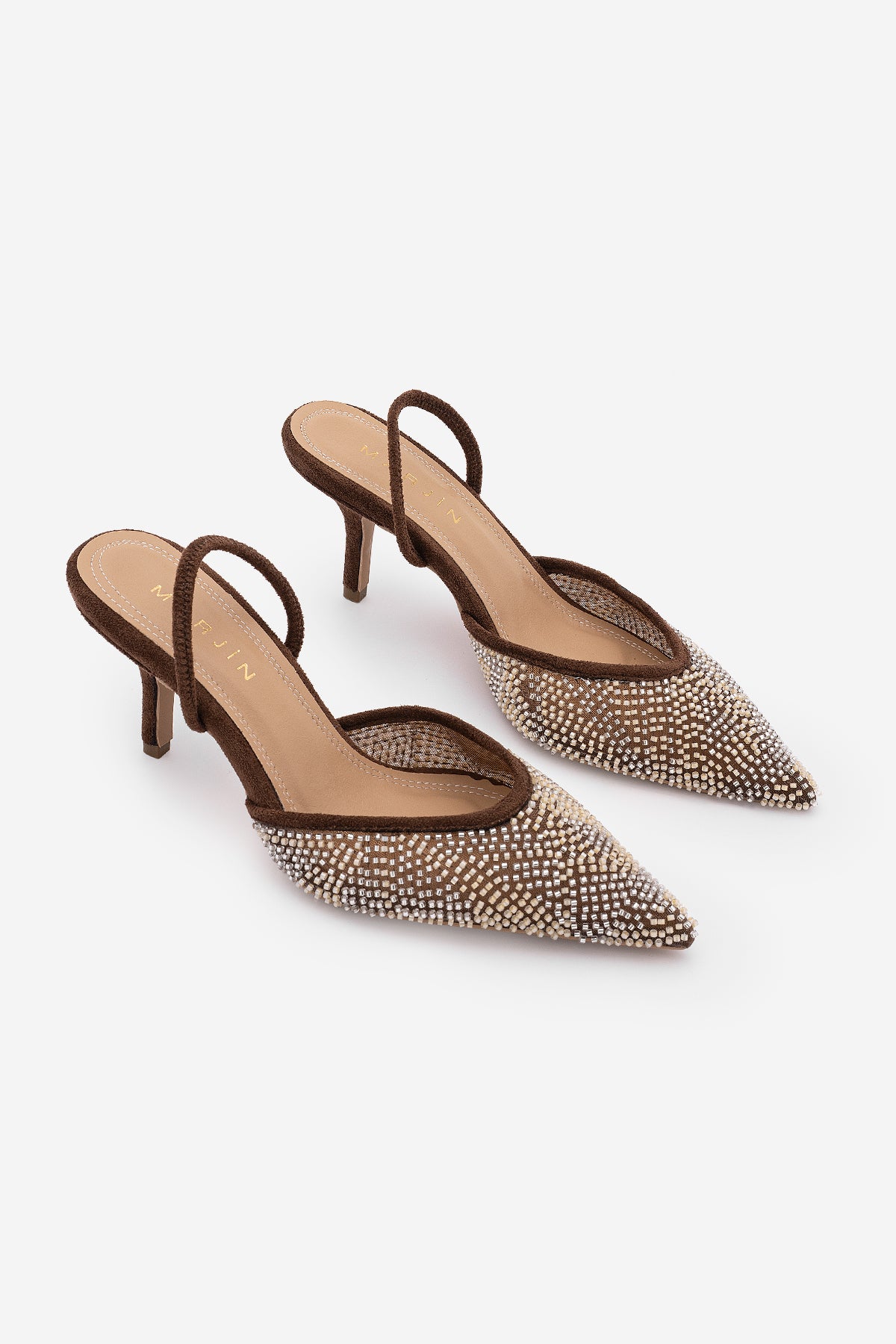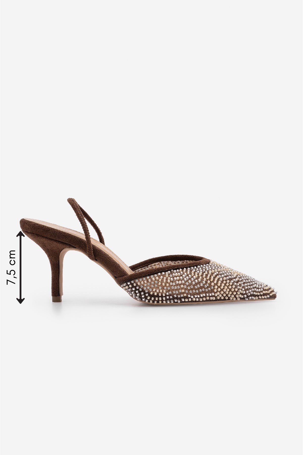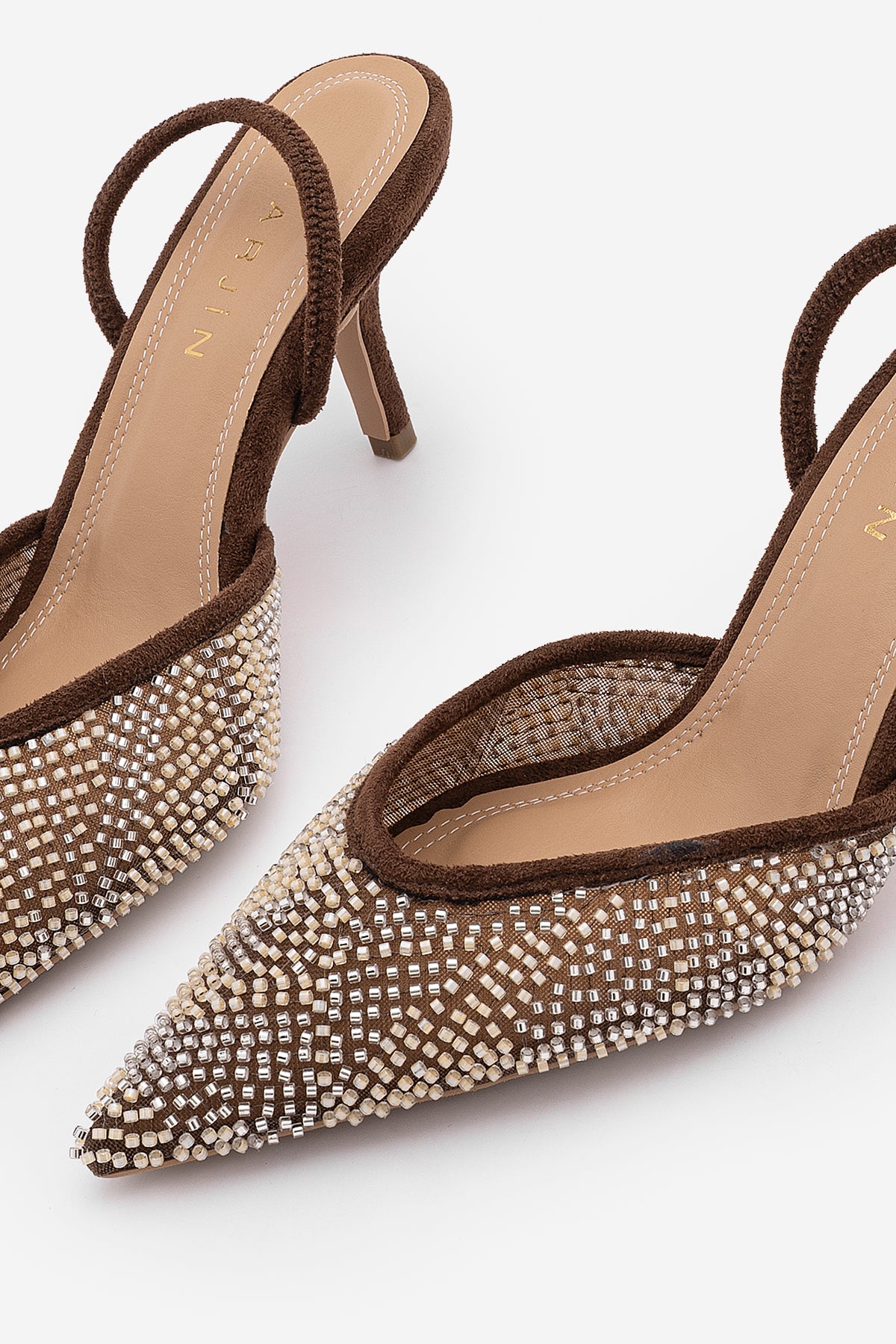 Kadın Stiletto Boncuklu İşlemeli Fileli Klasik Topuklu Ayakkabı Morose - Kahve Süet