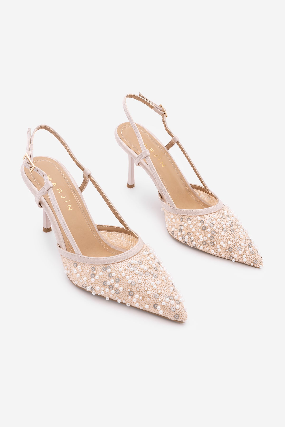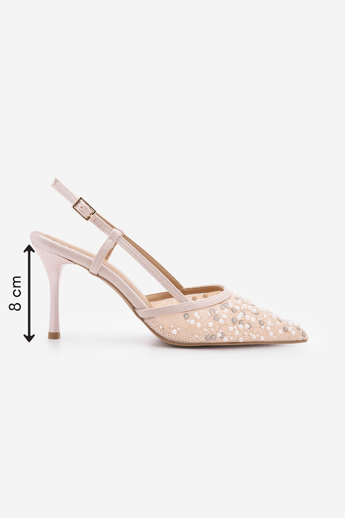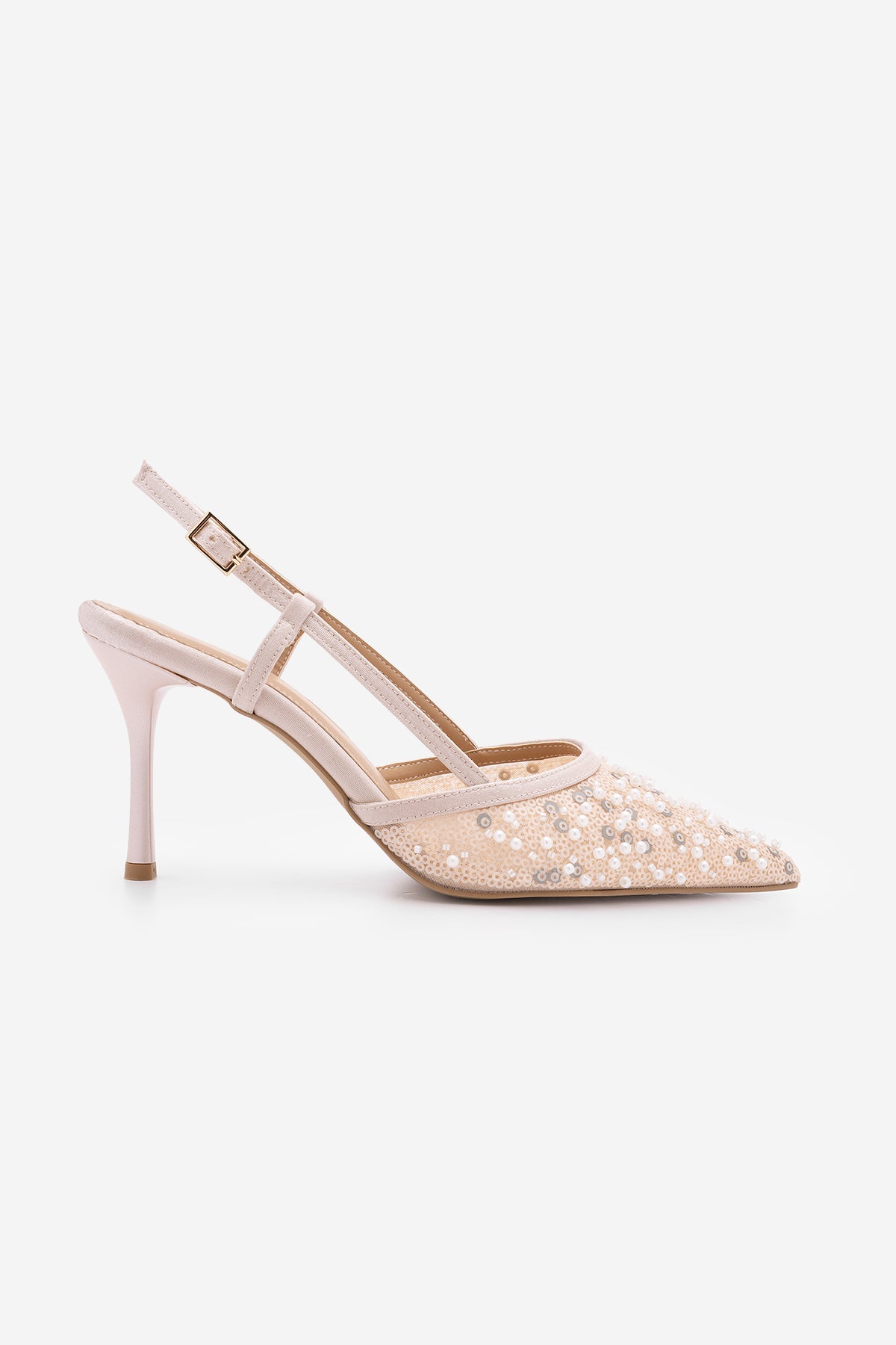 Kadın Stiletto Pullu Boncuklu Fileli Klasik Topuklu Ayakkabı Daruka - Pudra Saten