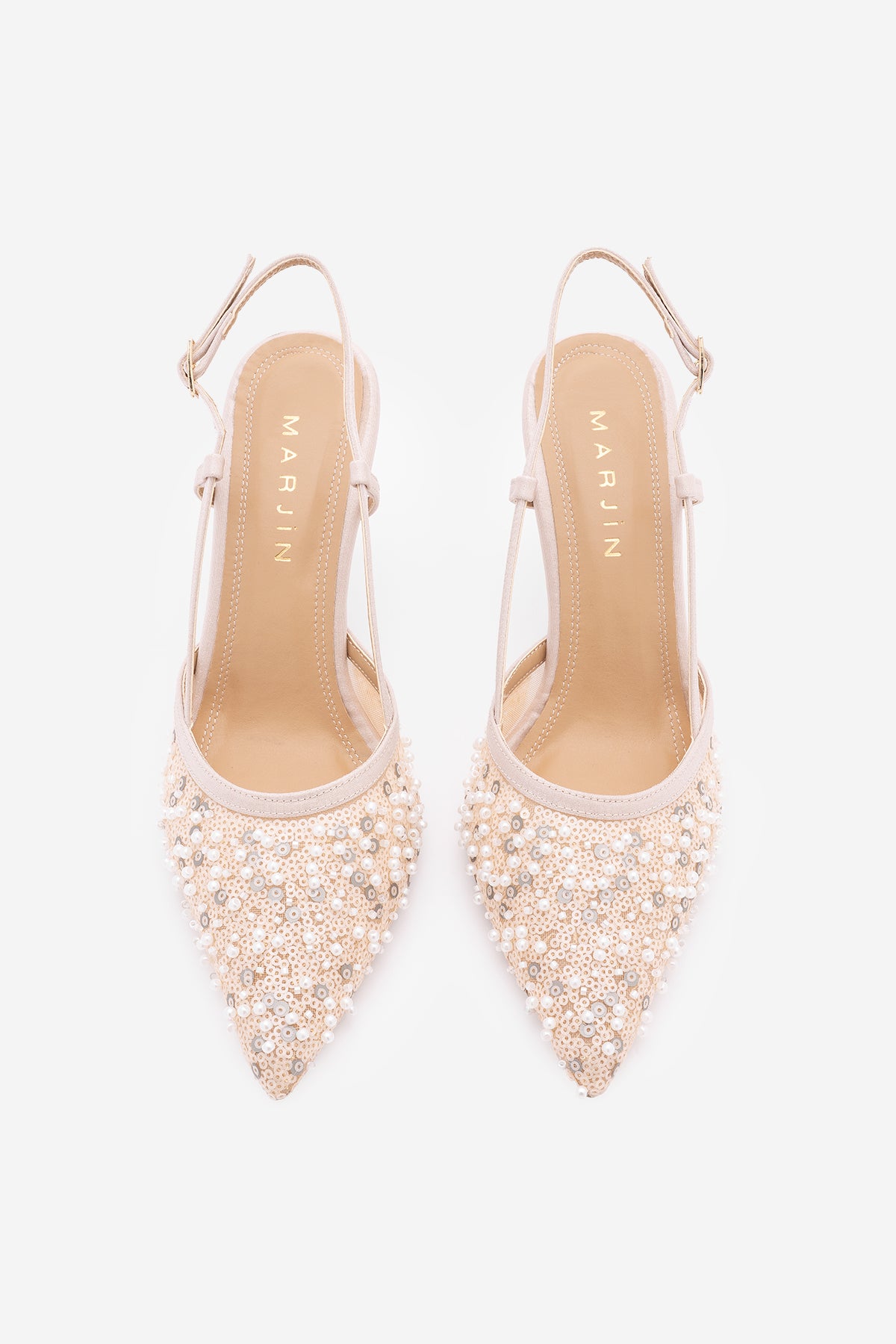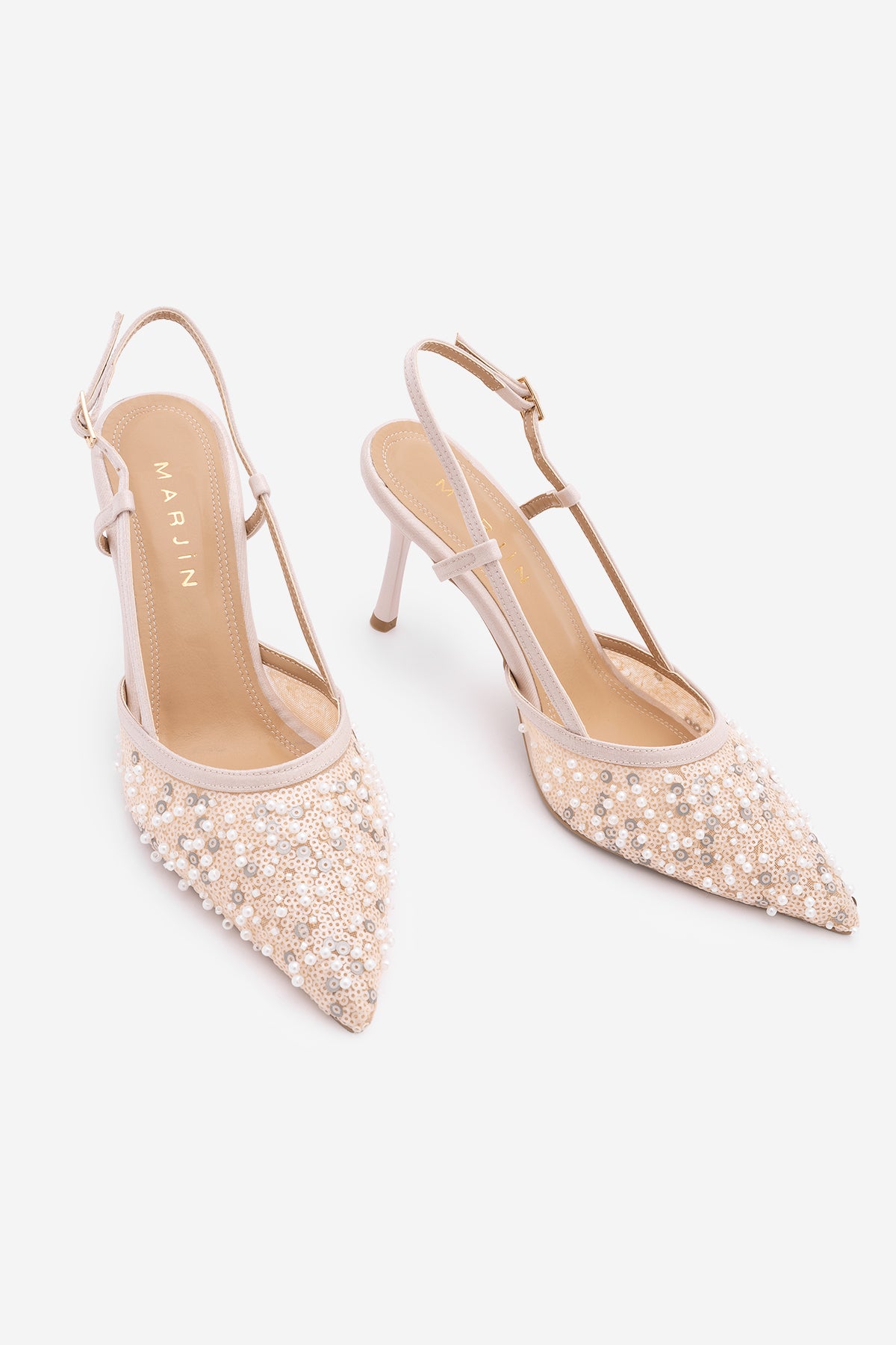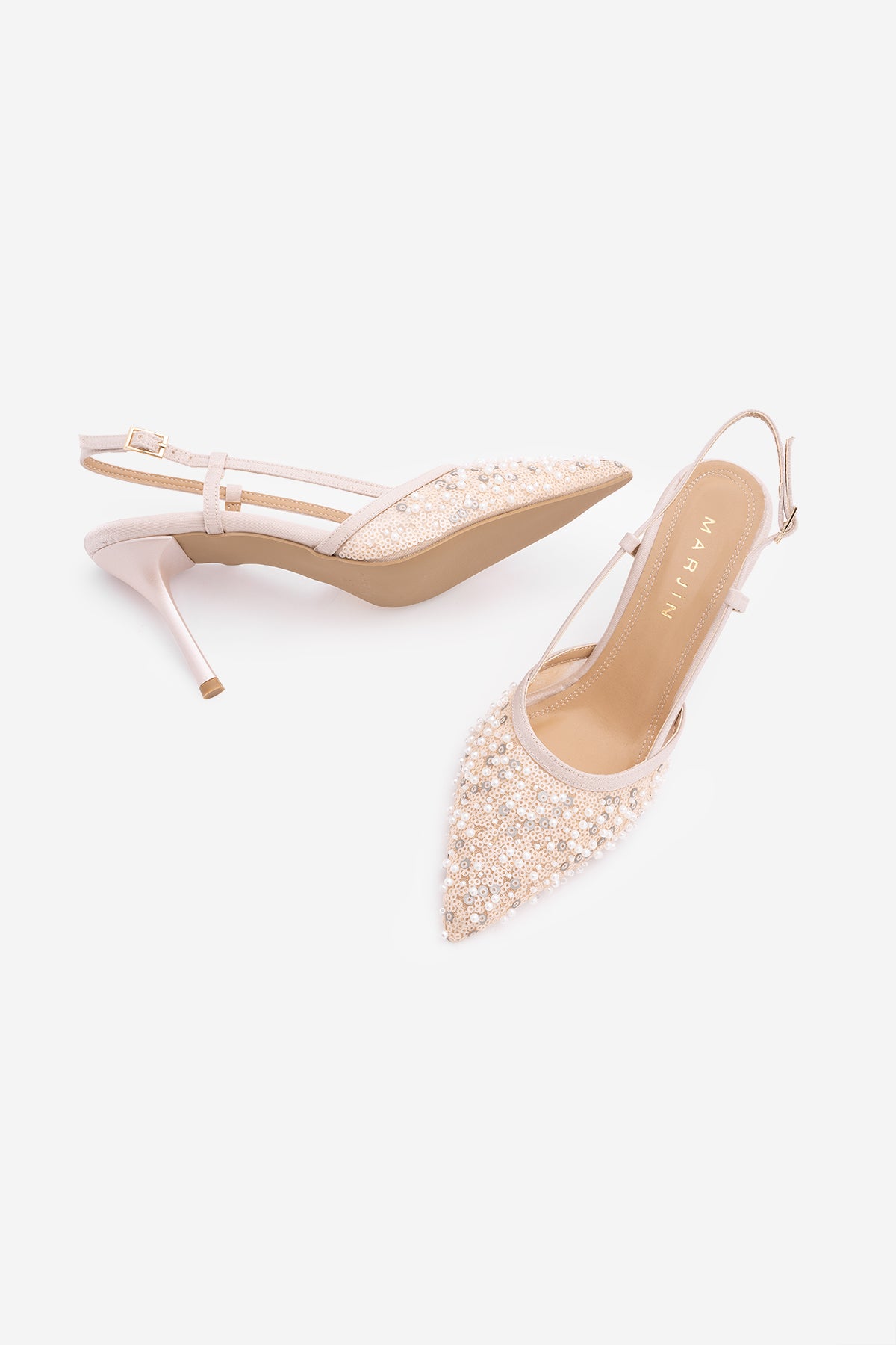 Kadın Stiletto Pullu Boncuklu Fileli Klasik Topuklu Ayakkabı Daruka - Pudra Saten