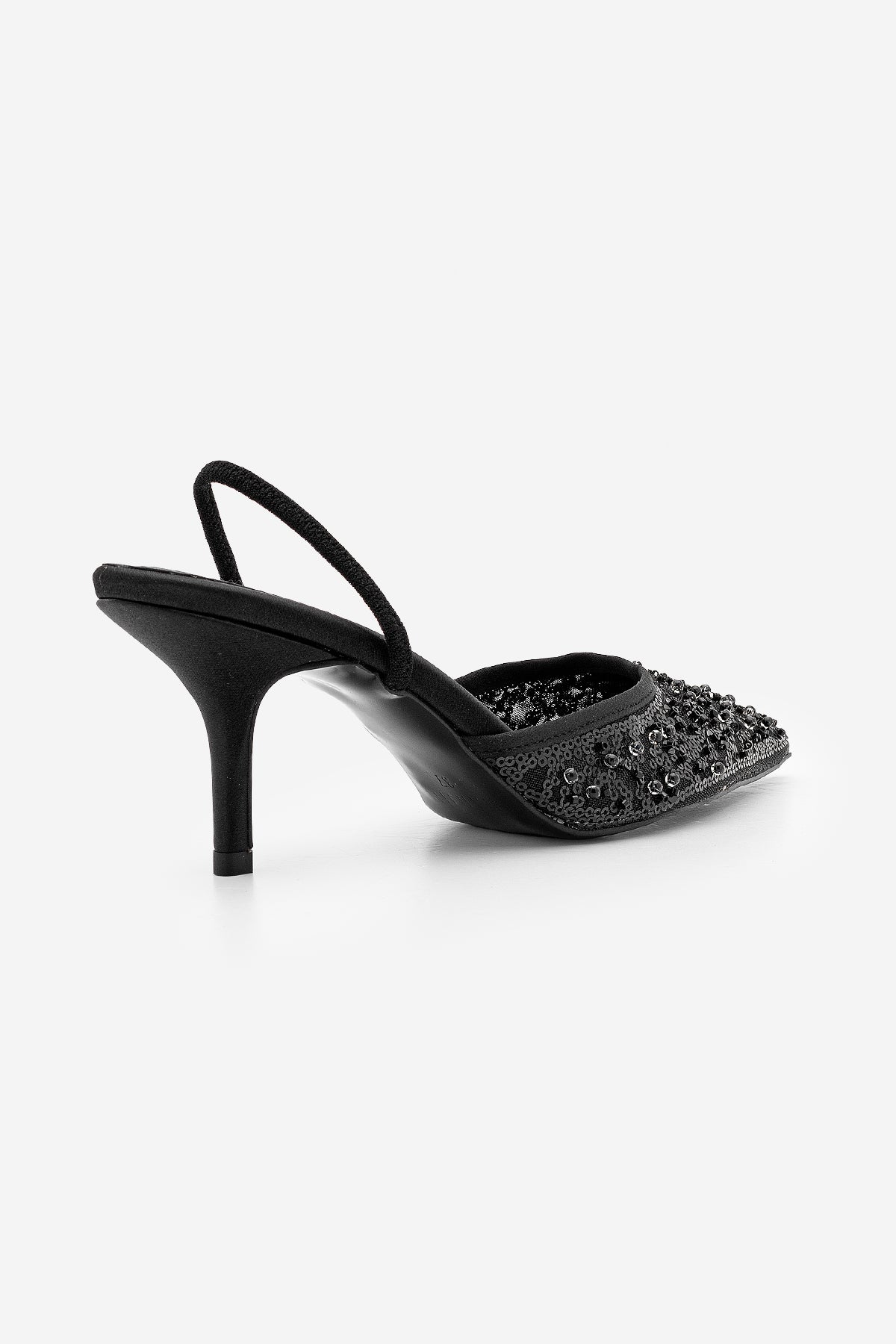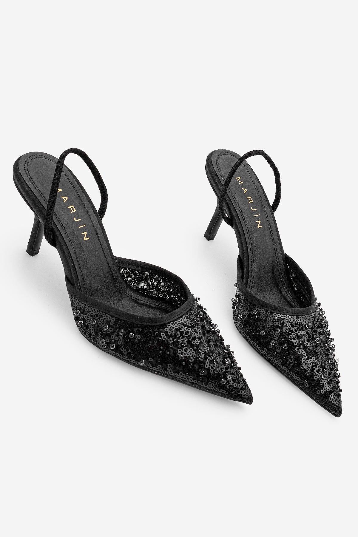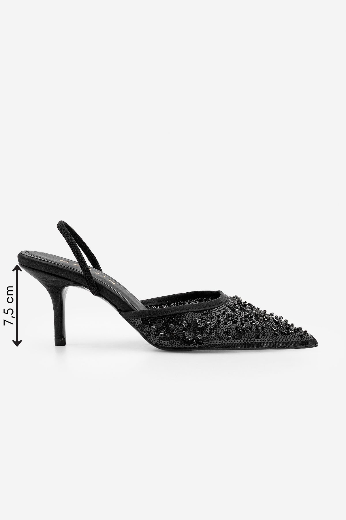 Kadın Stiletto Pullu Boncuklu İşlemeli Fileli Klasik Topuklu Ayakkabı Torliza - Siyah Saten