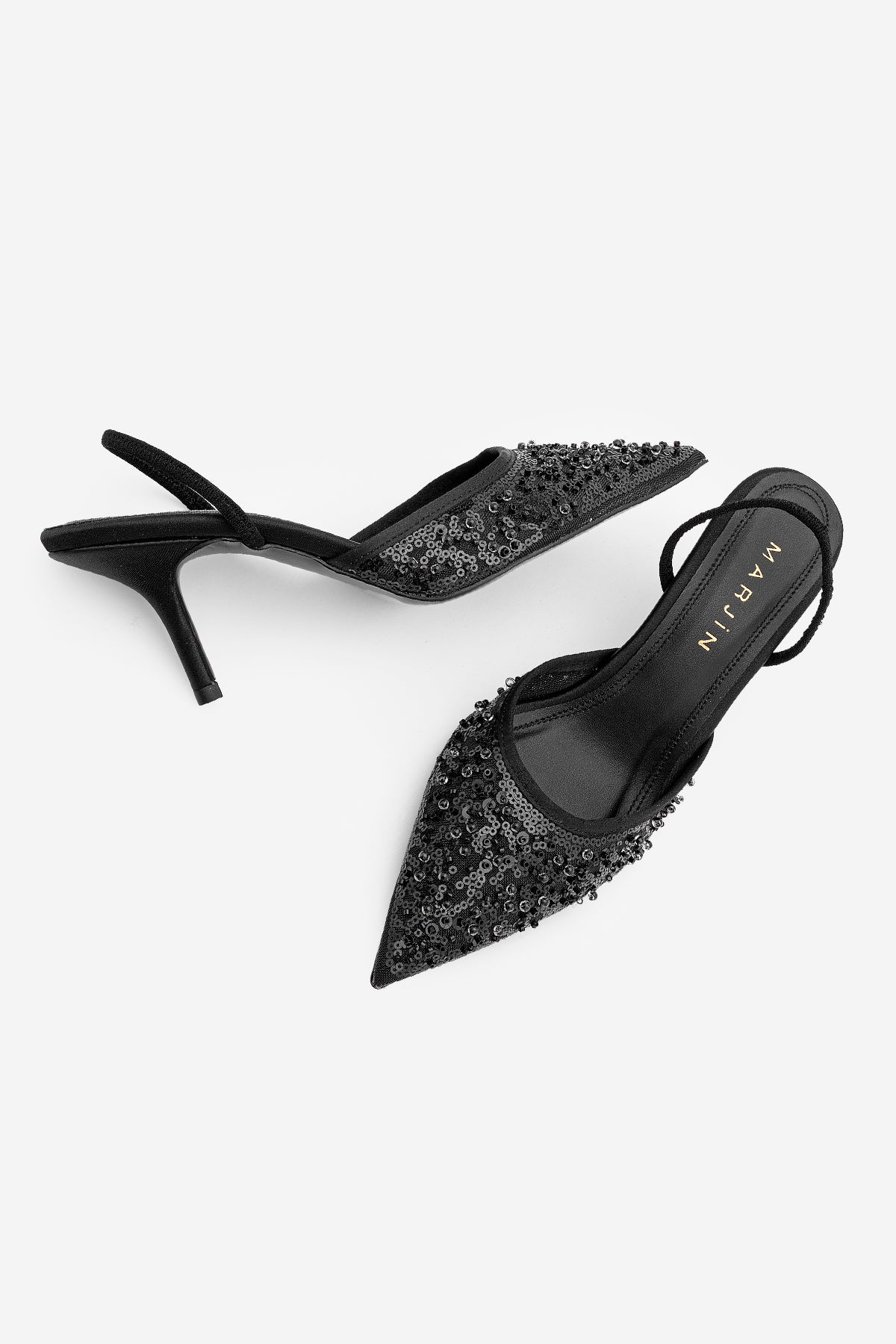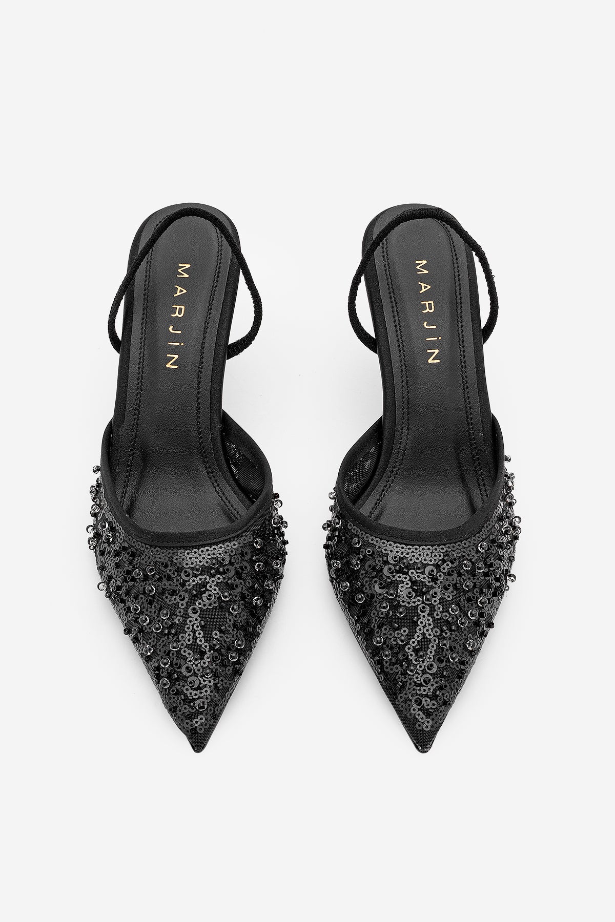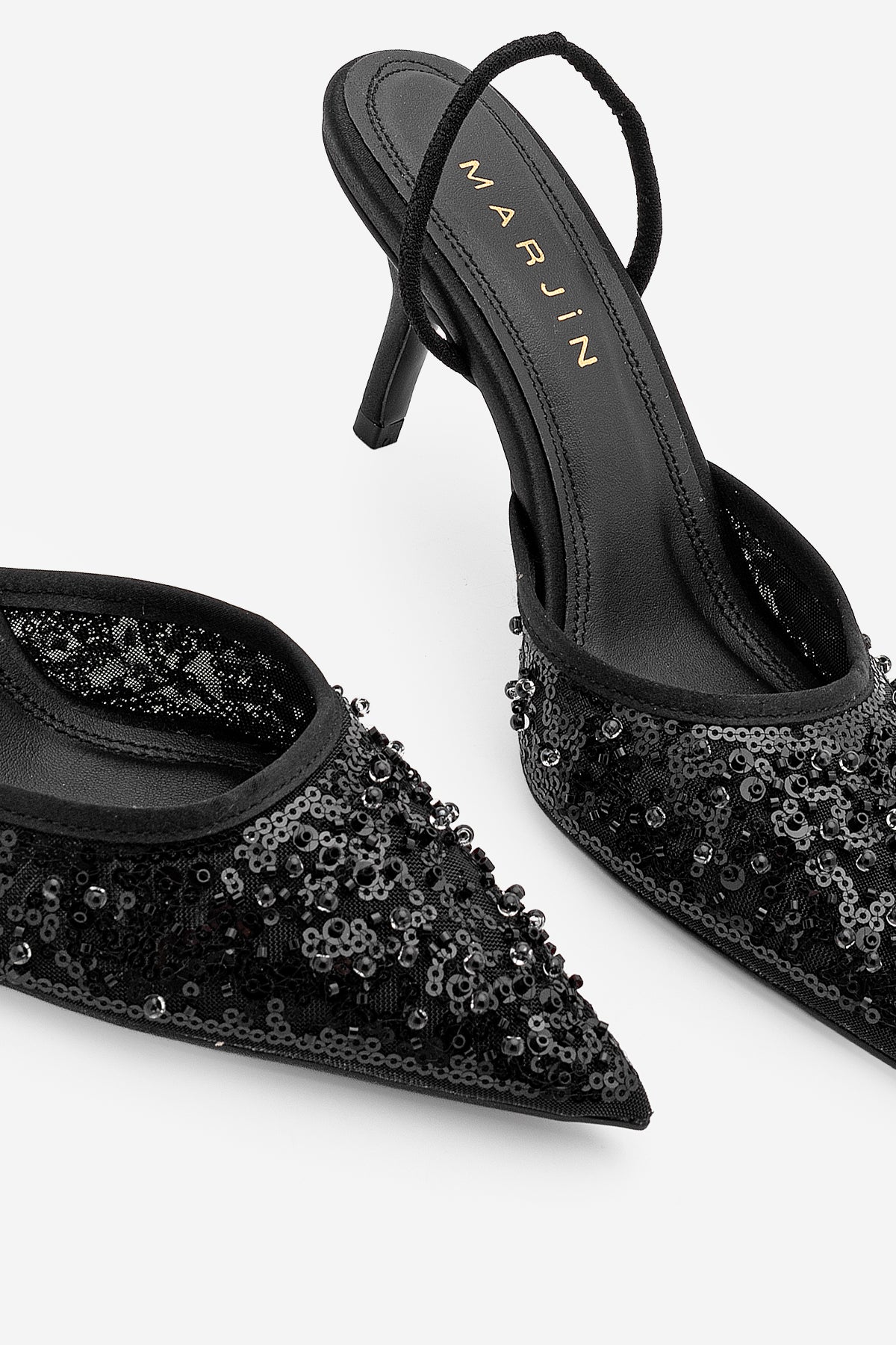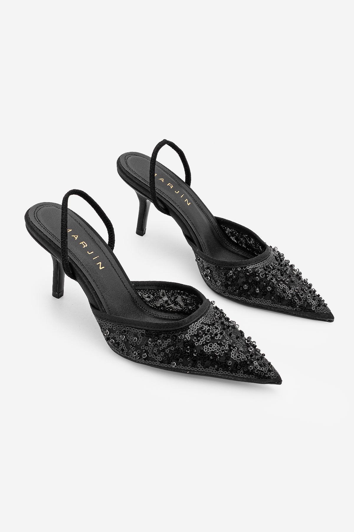 Kadın Stiletto Pullu Boncuklu İşlemeli Fileli Klasik Topuklu Ayakkabı Torliza - Siyah Saten