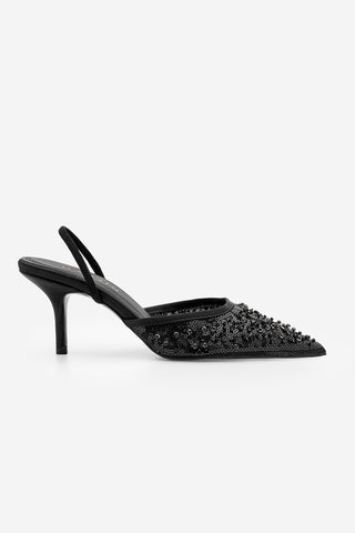 Kadın Stiletto Pullu Boncuklu İşlemeli Fileli Klasik Topuklu Ayakkabı Torliza - Siyah Saten