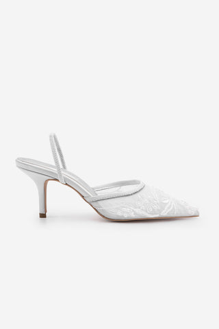 Kadın Stiletto Boncuklu Fileli Nakışlı İşlemeli Klasik Topuklu Ayakkabı Velsedi - Gümüş Saten