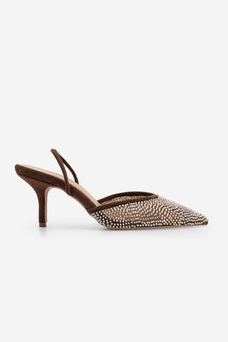 Kadın Stiletto Boncuklu İşlemeli Fileli Klasik Topuklu Ayakkabı Morose - Kahve Süet