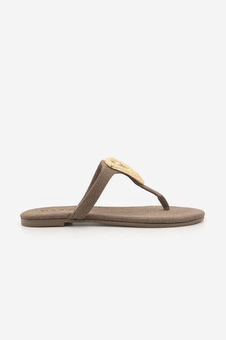 Kadın Parmak Arası Altın Tokalı Taşlı Günlük Terlik Rolin - Vizon Süet