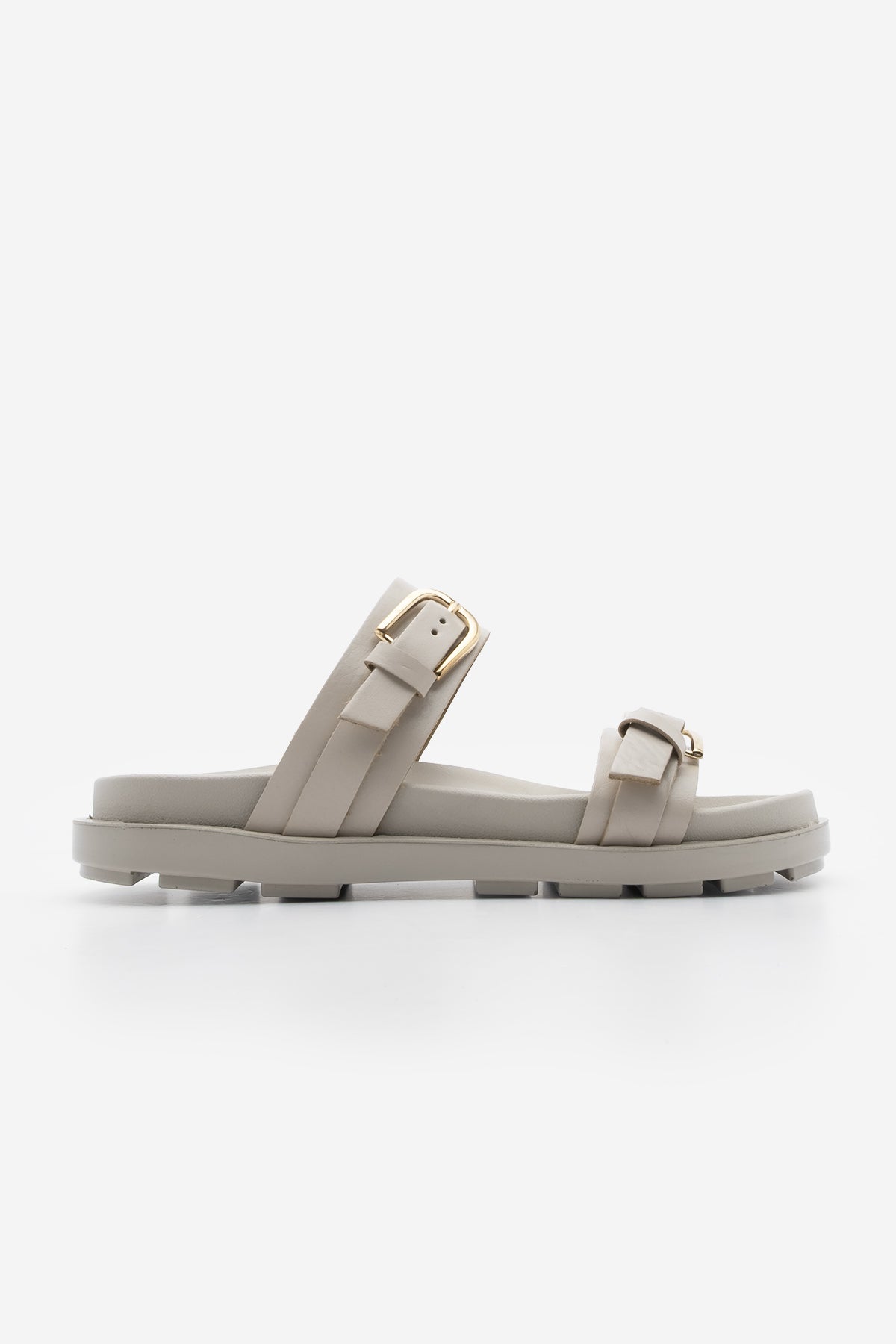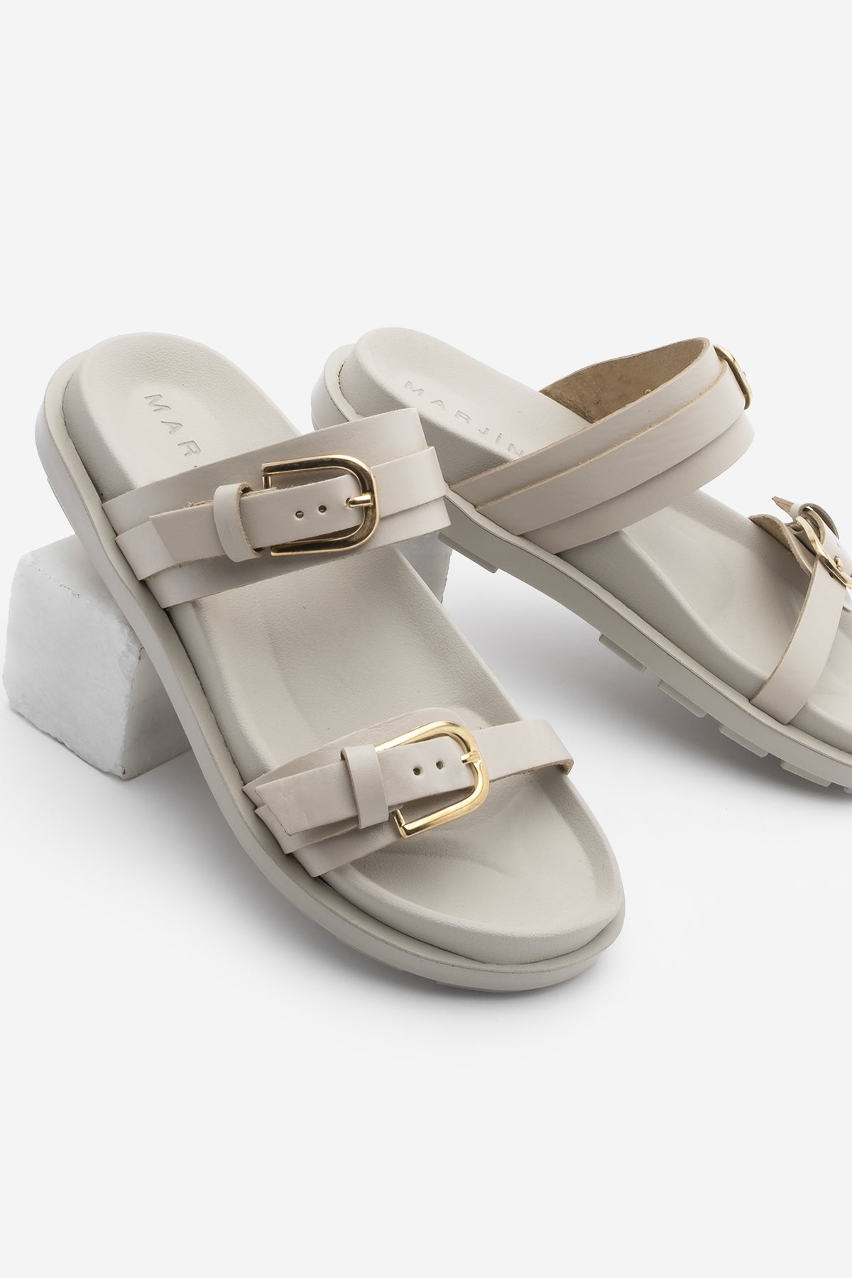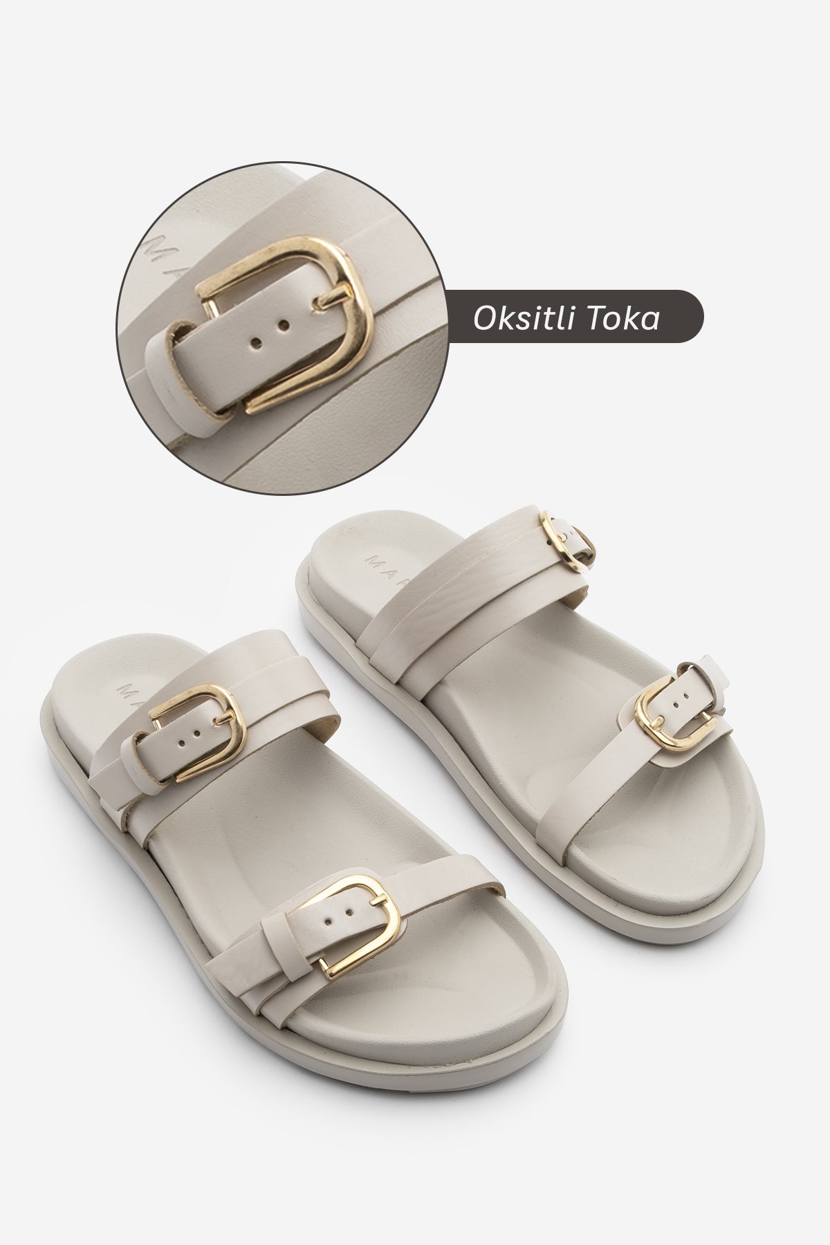 Kadın Hakiki Deri Çift Bantlı Günlük Terlik Tanva - Ekru
