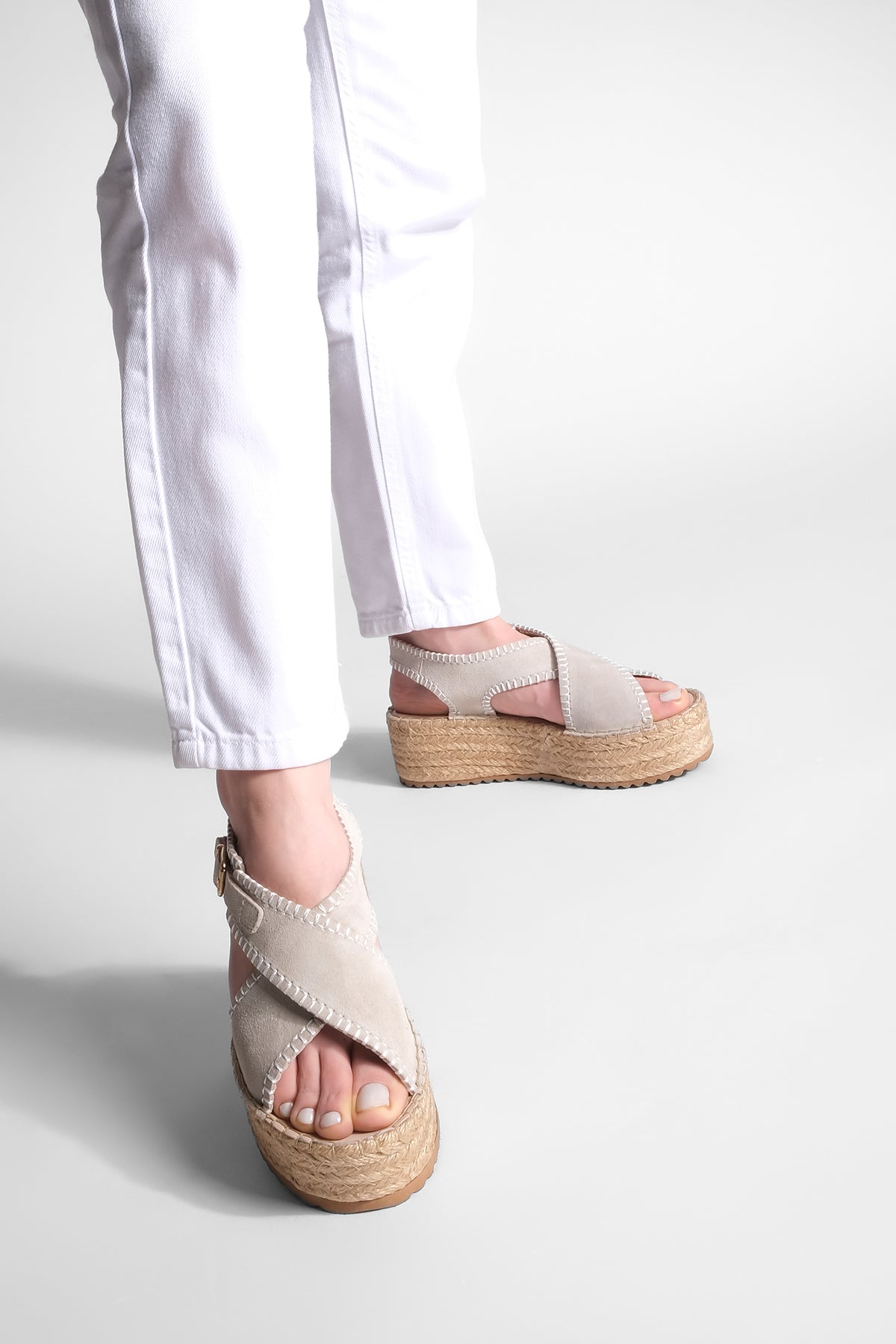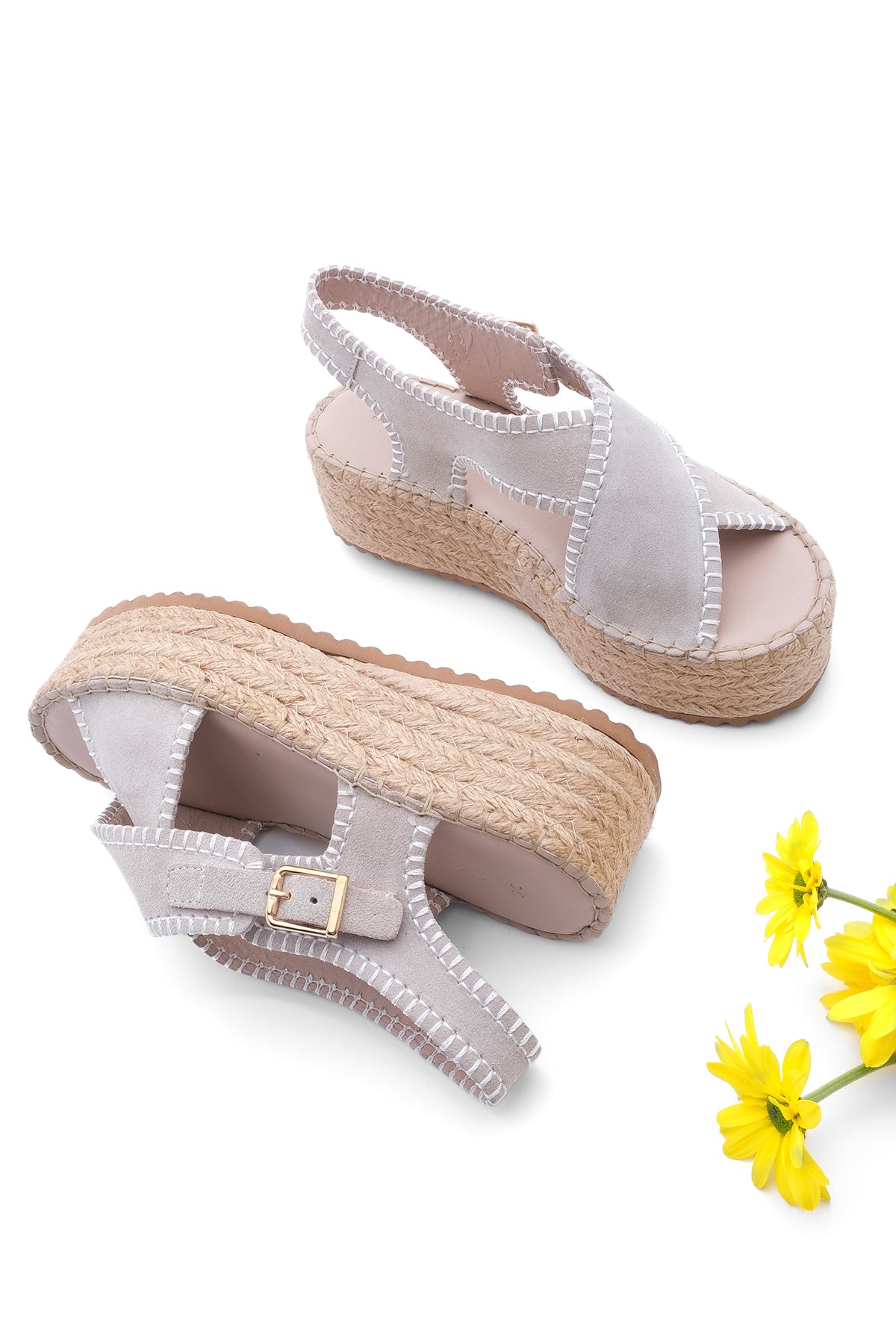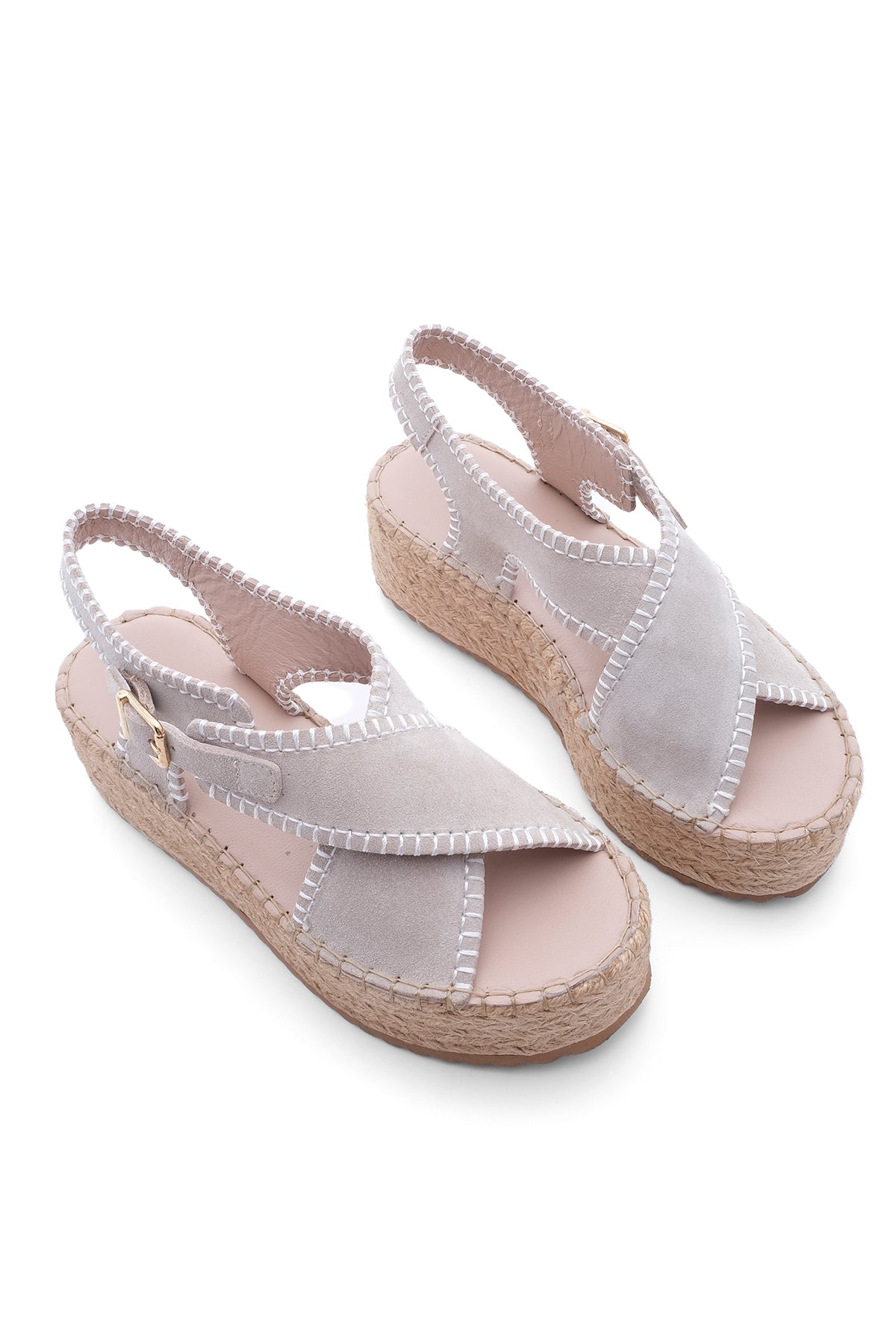 Kadın Hakiki Deri Dolgu Topuk Espadril Sandalet Takres - Bej Süet