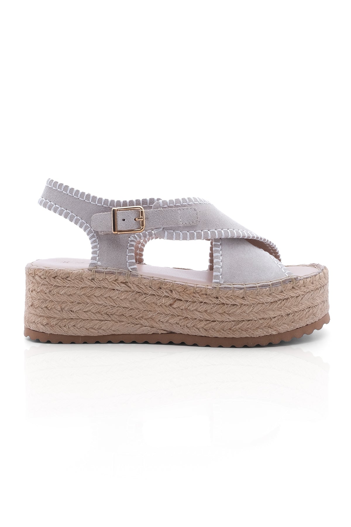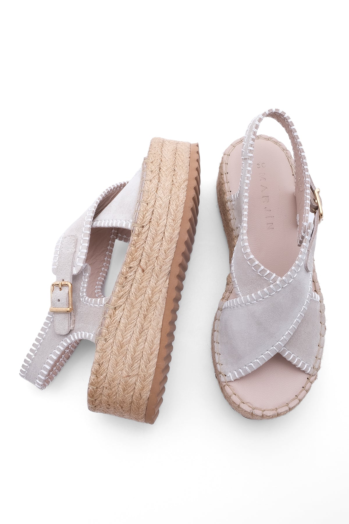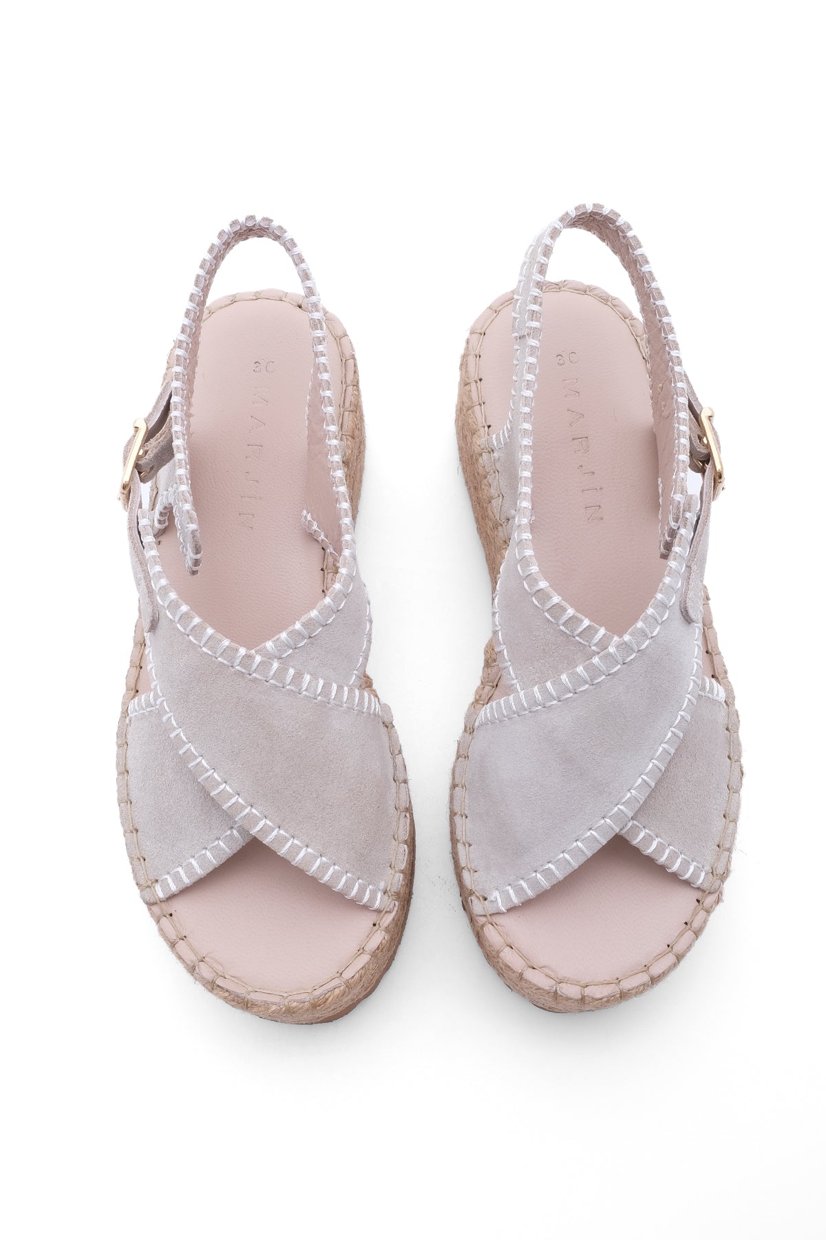 Kadın Hakiki Deri Dolgu Topuk Espadril Sandalet Takres - Bej Süet