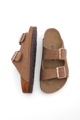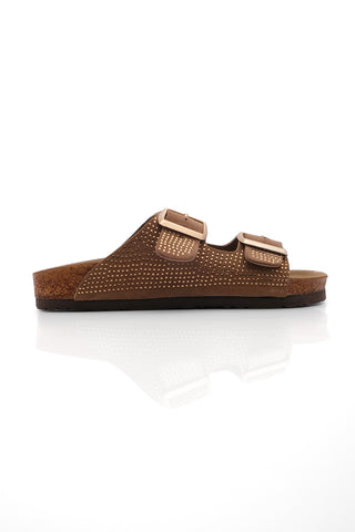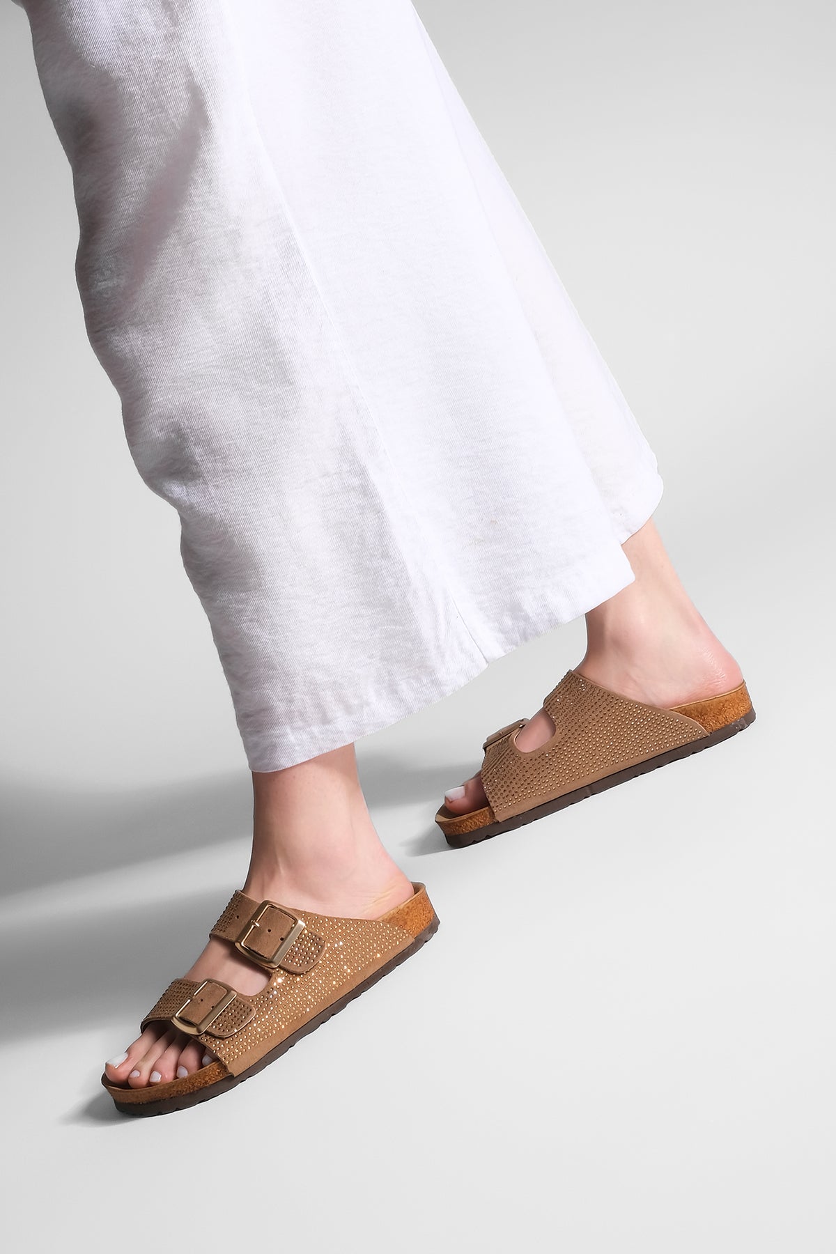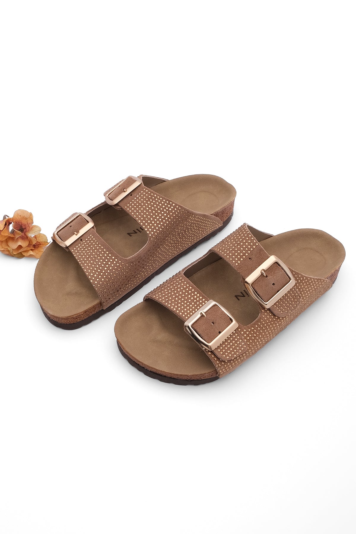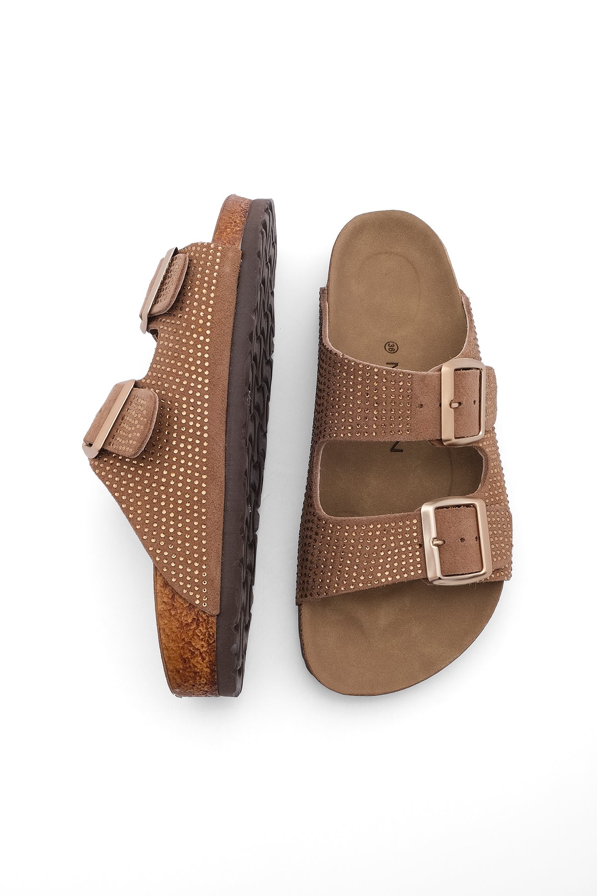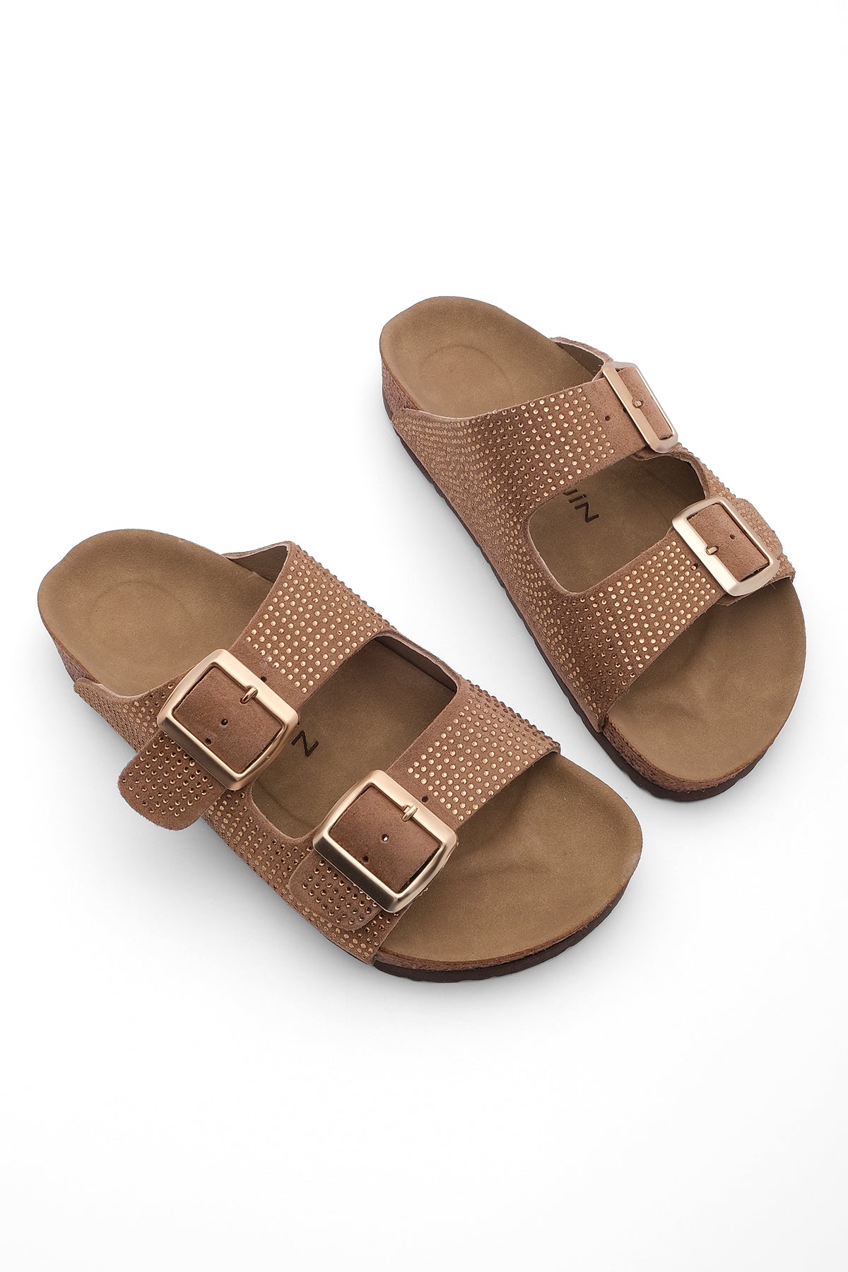 Kadın Hakiki Deri Eva Taban Günlük Taşlı Terlik Ponet - Taba