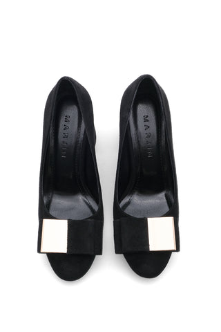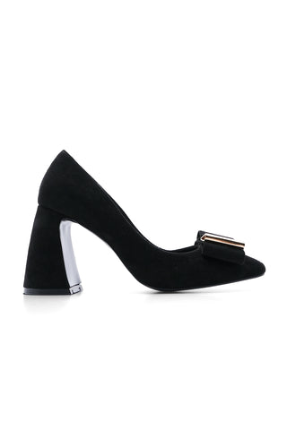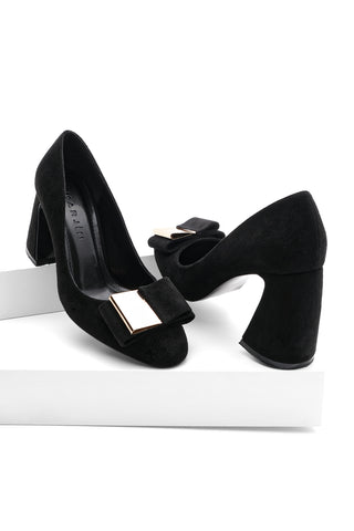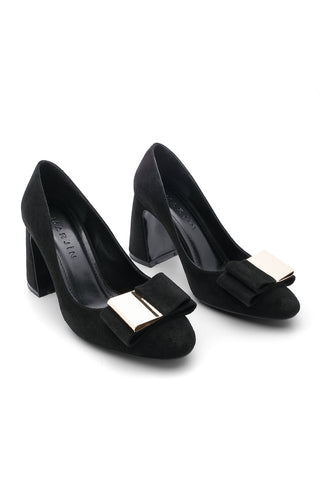 Kadın Kalın Topuk Altın Fiyonk Detay Klasik Topuklu Ayakkabı Delin - Siyah Süet