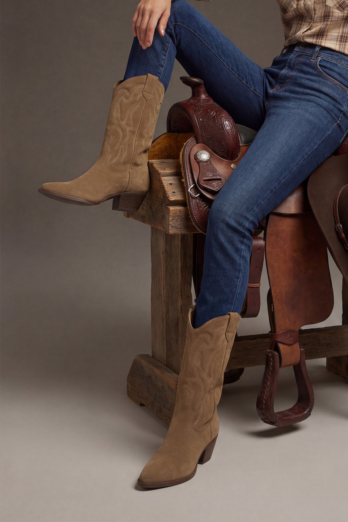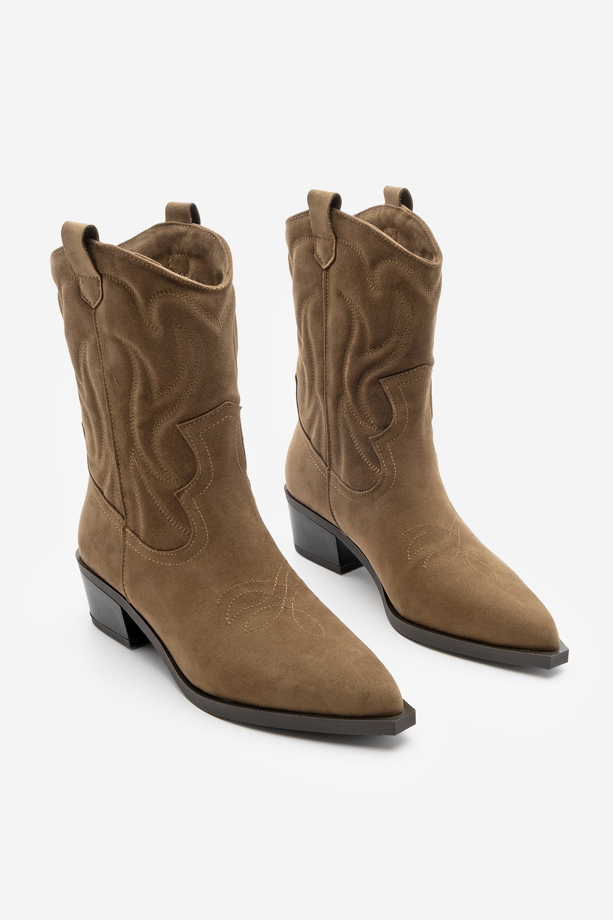 Kadın Sivri Burun Nakışlı Western Bot Nilva - Taba Süet