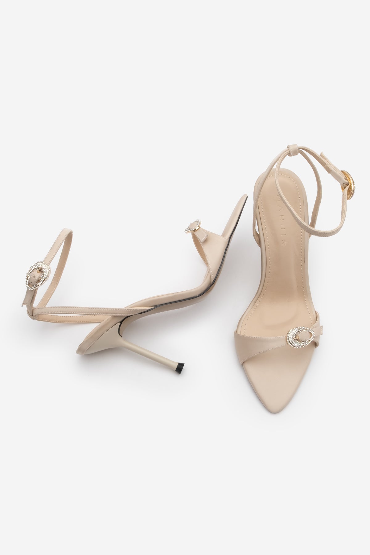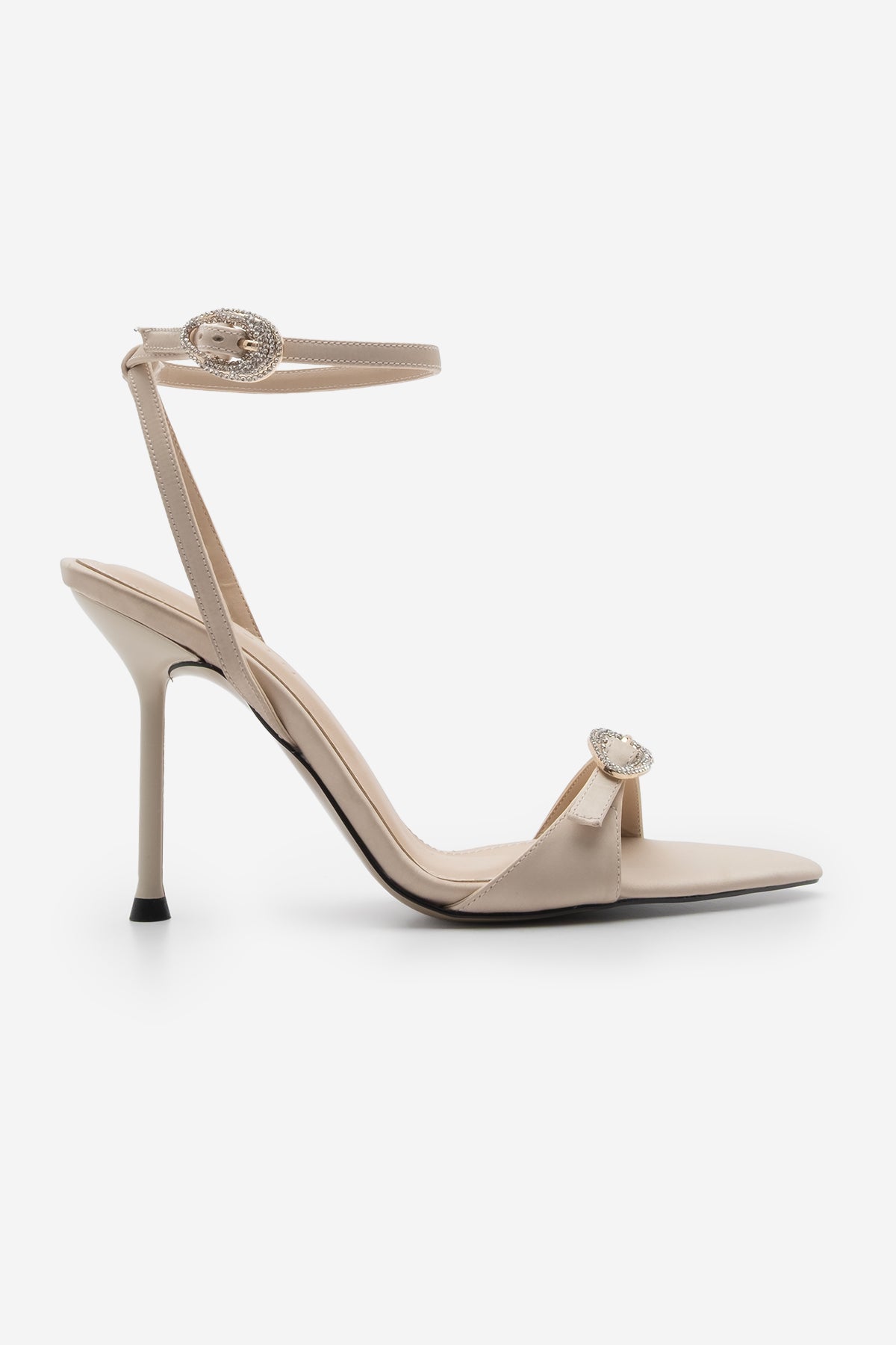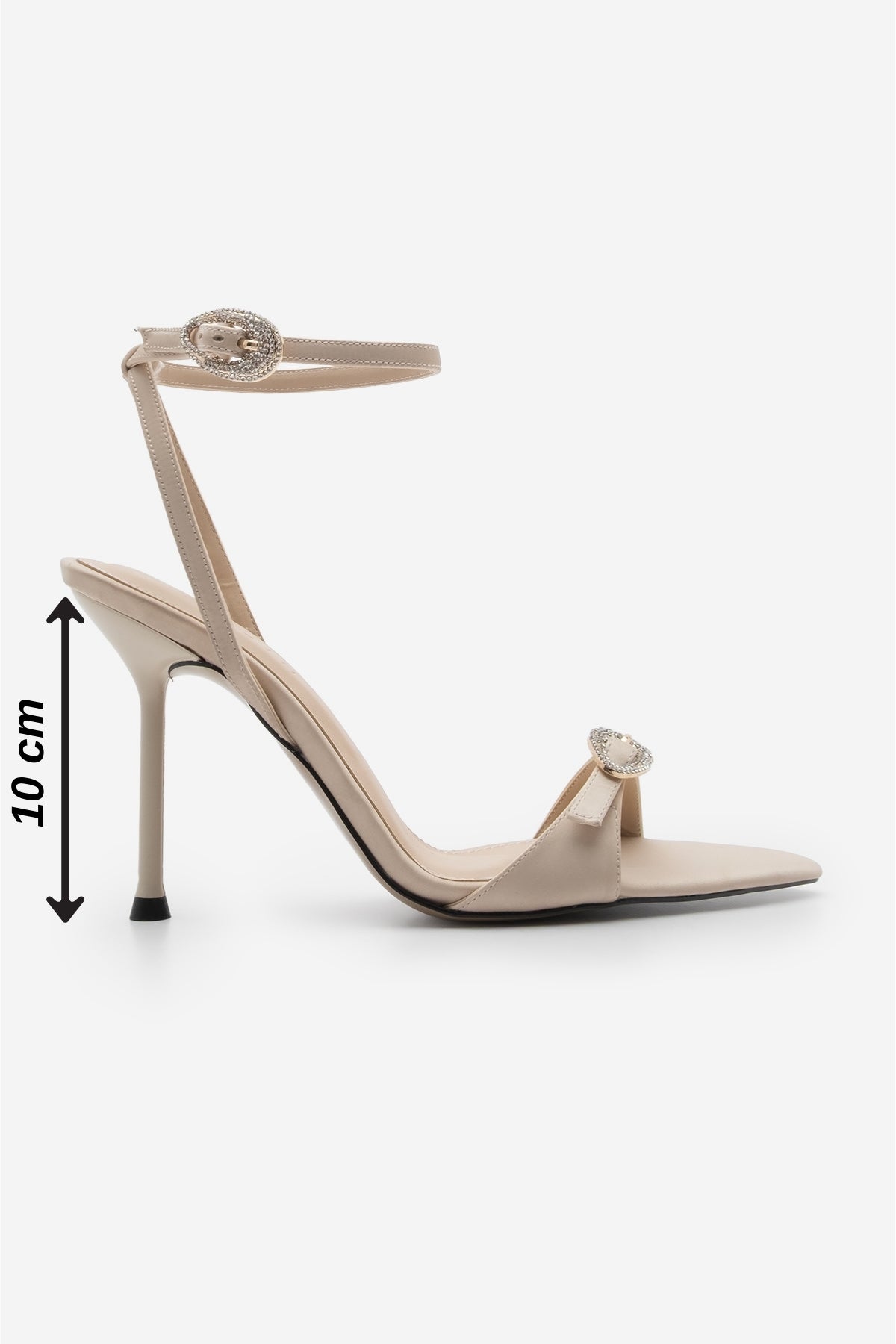 Kadın Sivri Burun Taşlı Topuklu Sandalet Bileza - Bej Saten