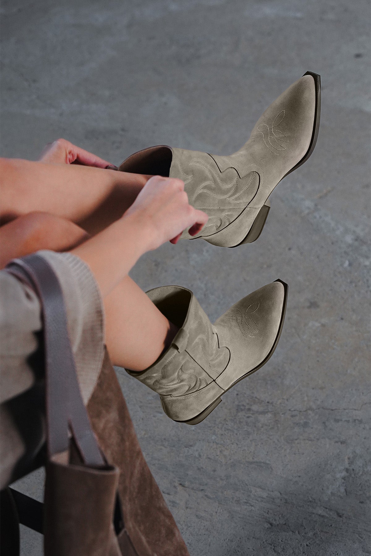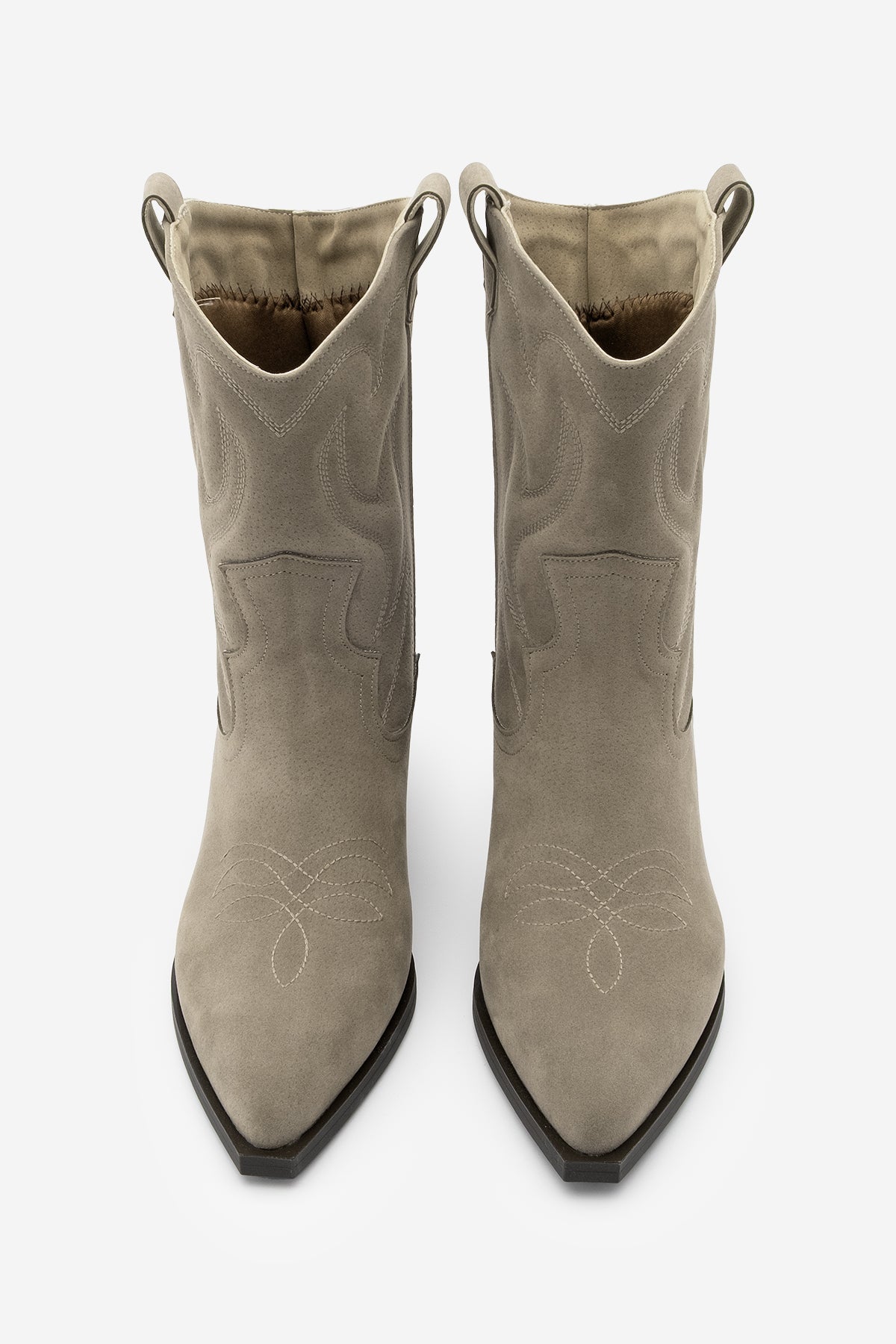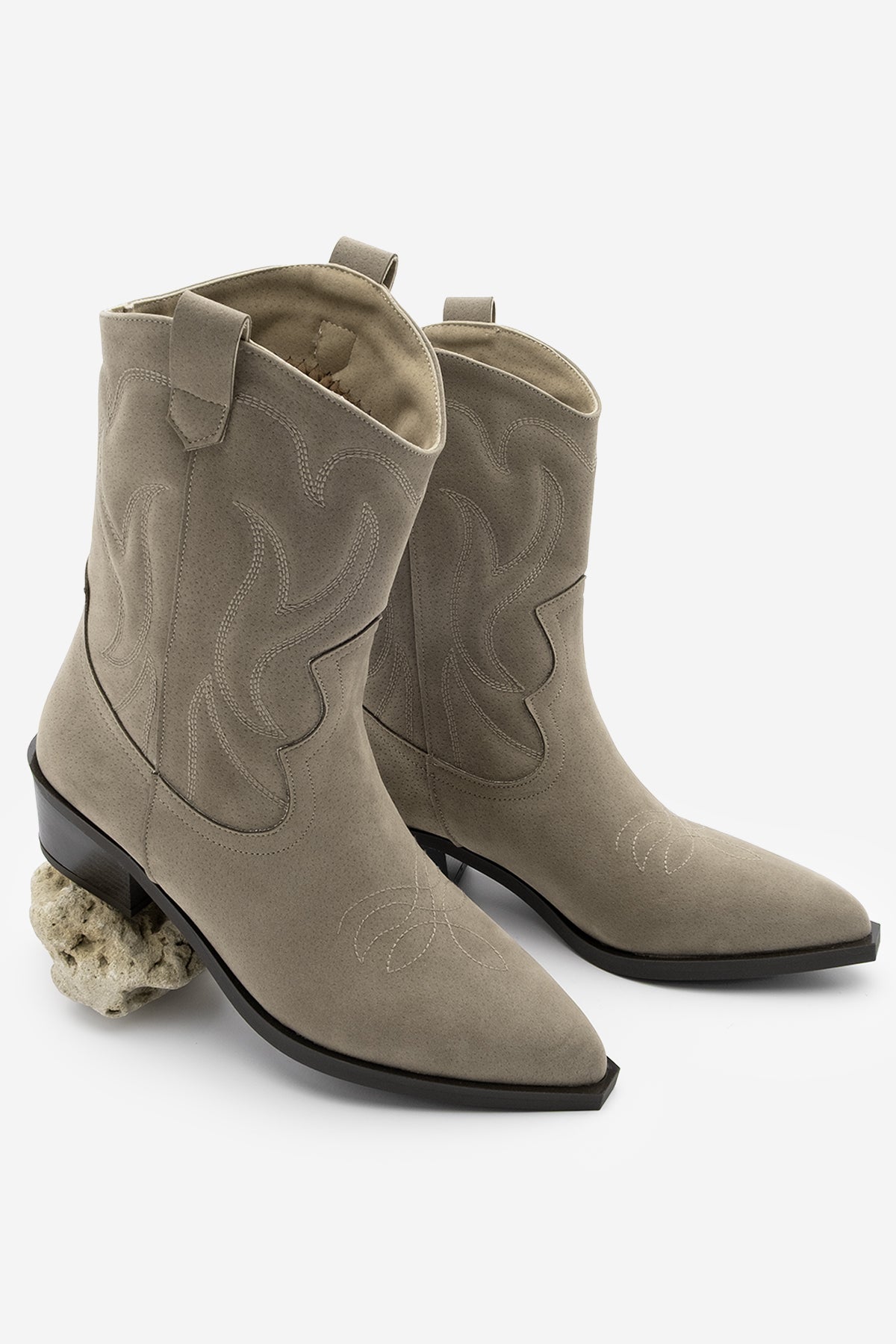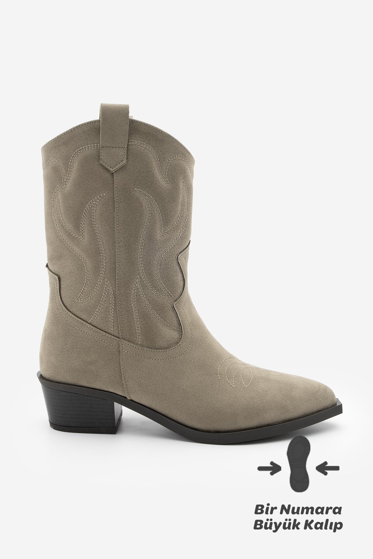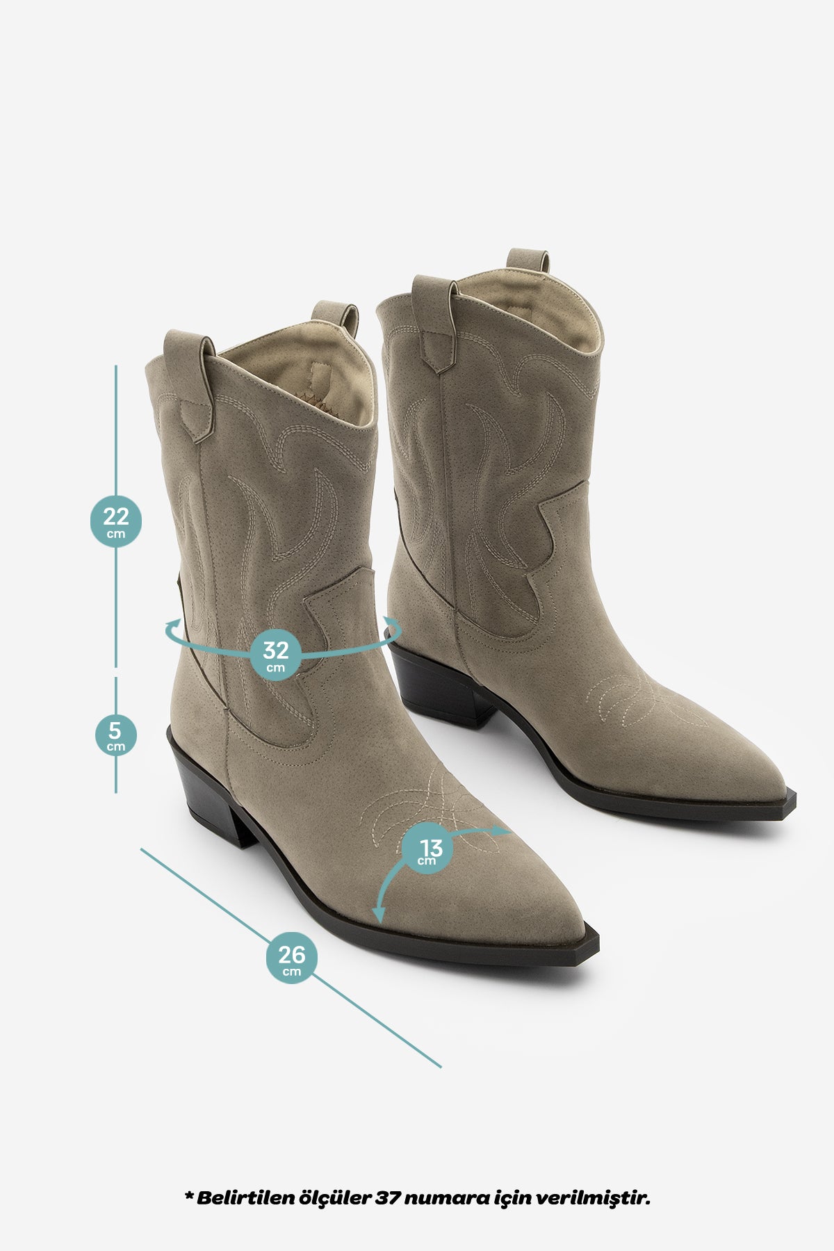 Kadın Sivri Burun Nakışlı Western Bot Nilva - Vizon Süet
