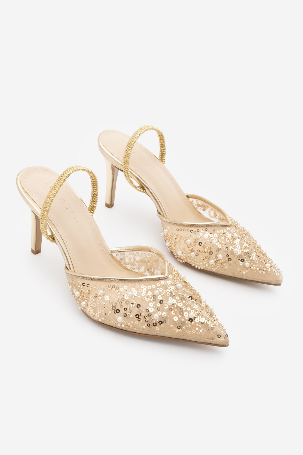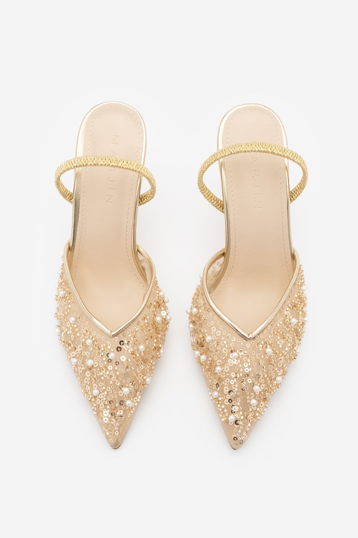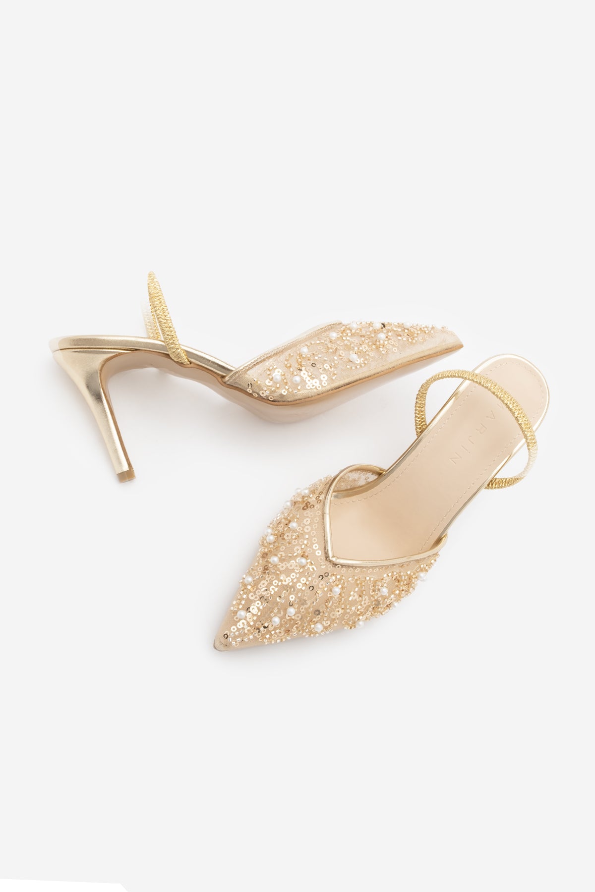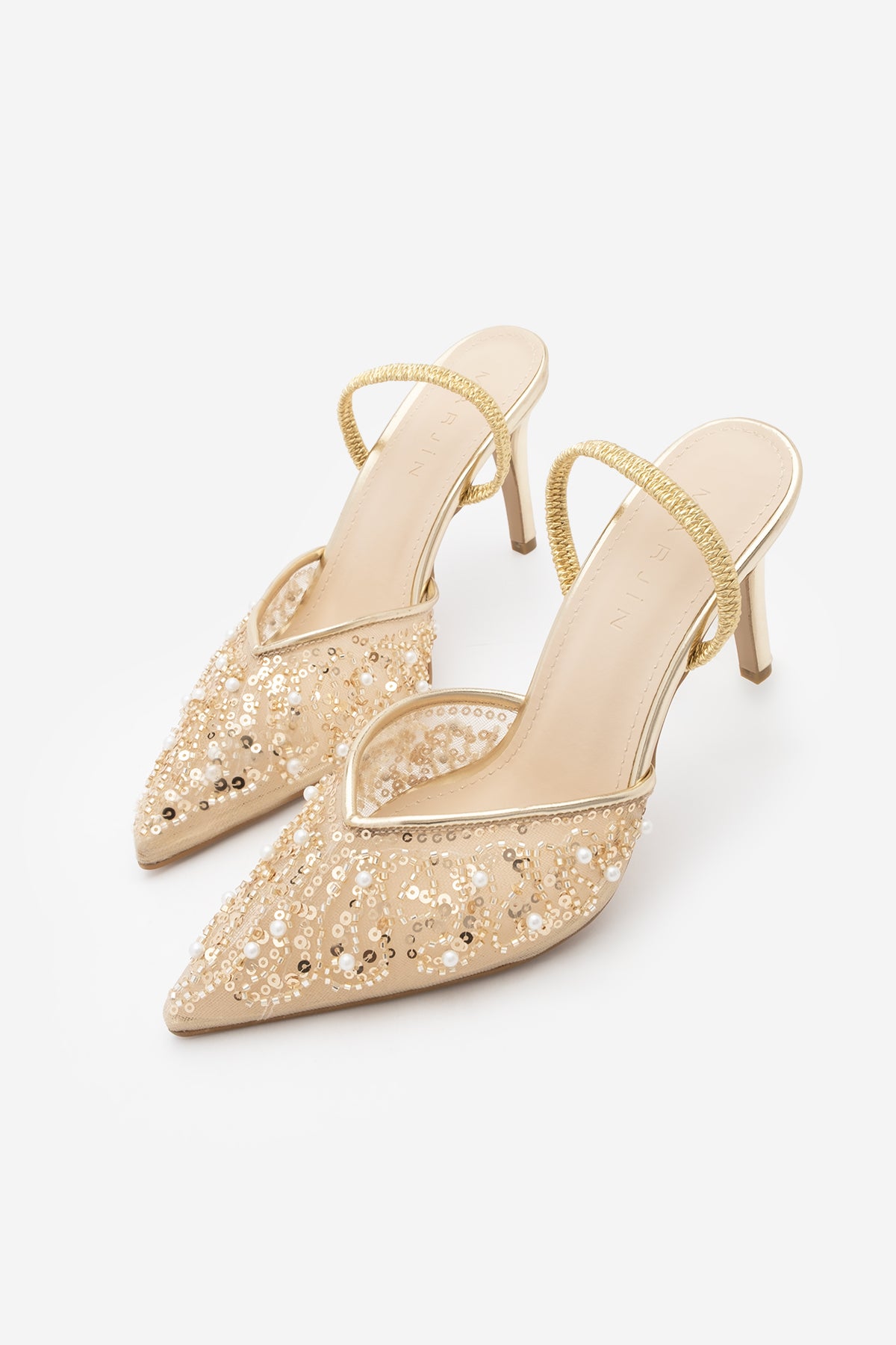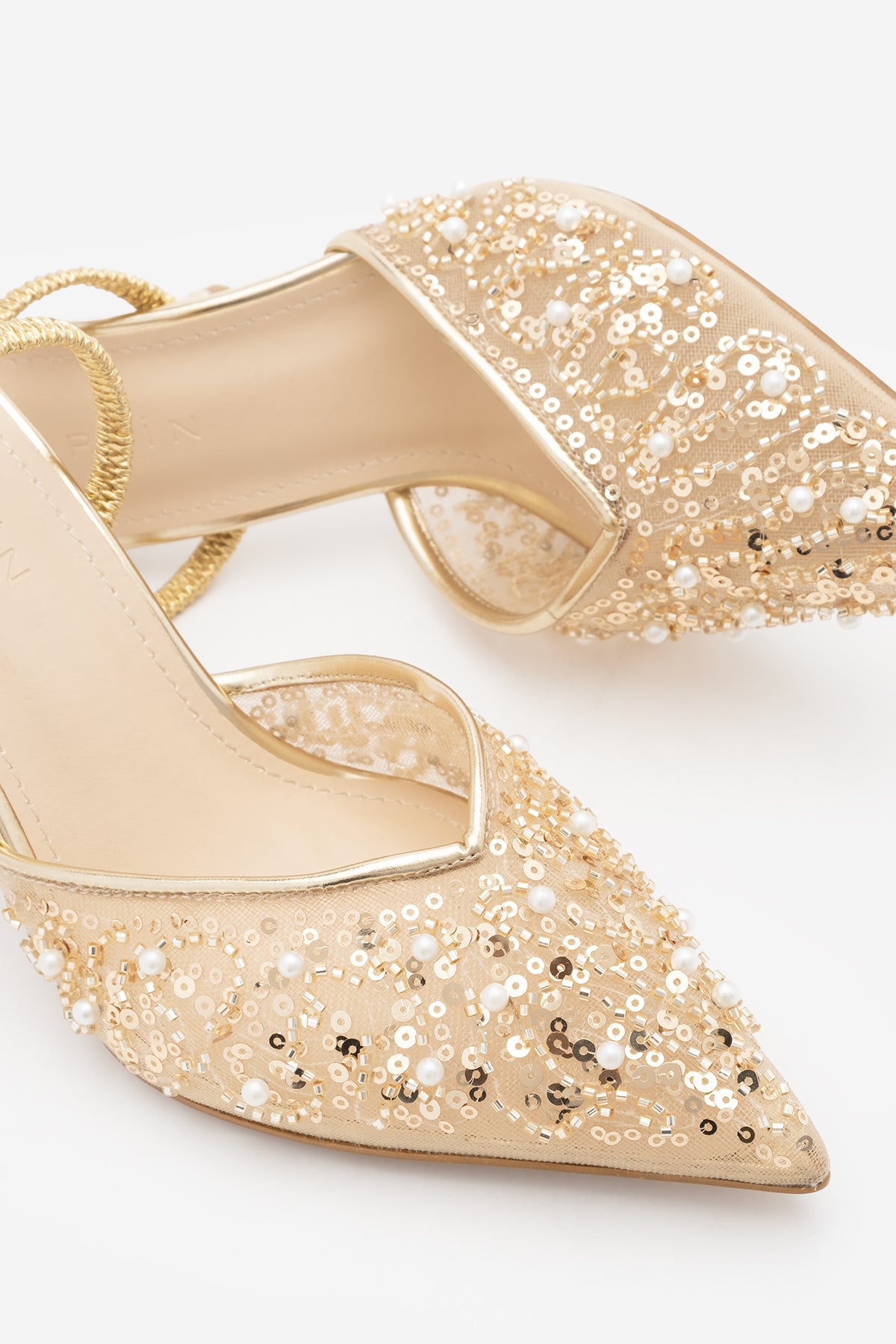 Kadın Stiletto İşlemeli File Boncuklu Topuklu Ayakkabı Sendi - Altın
