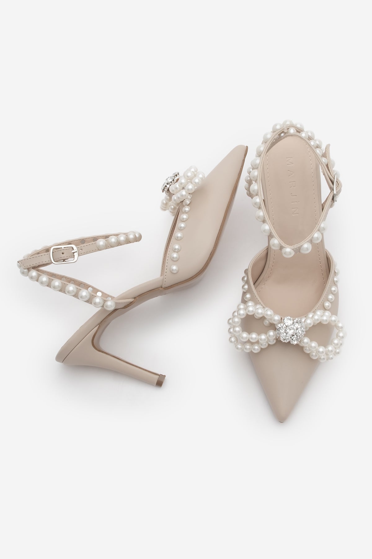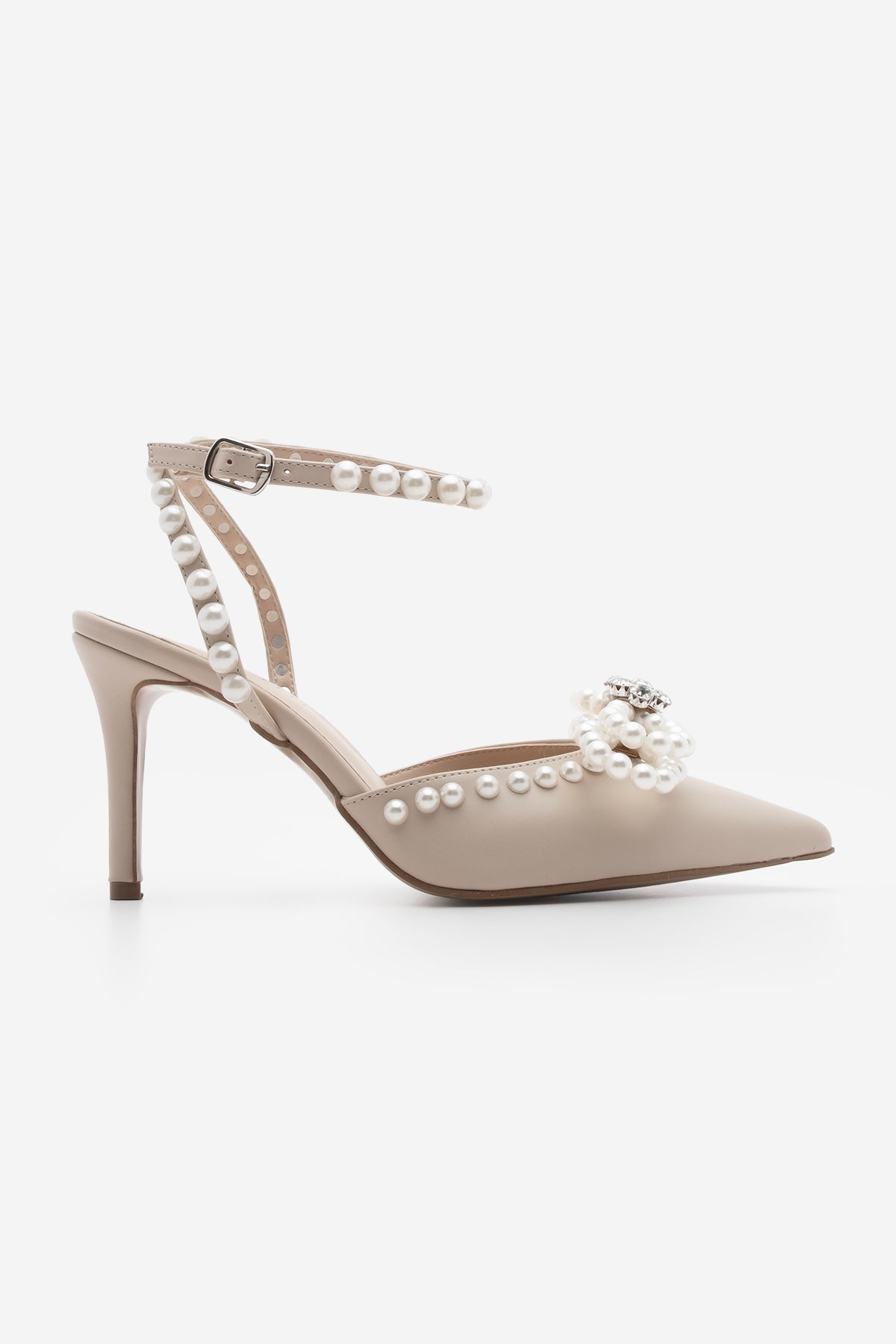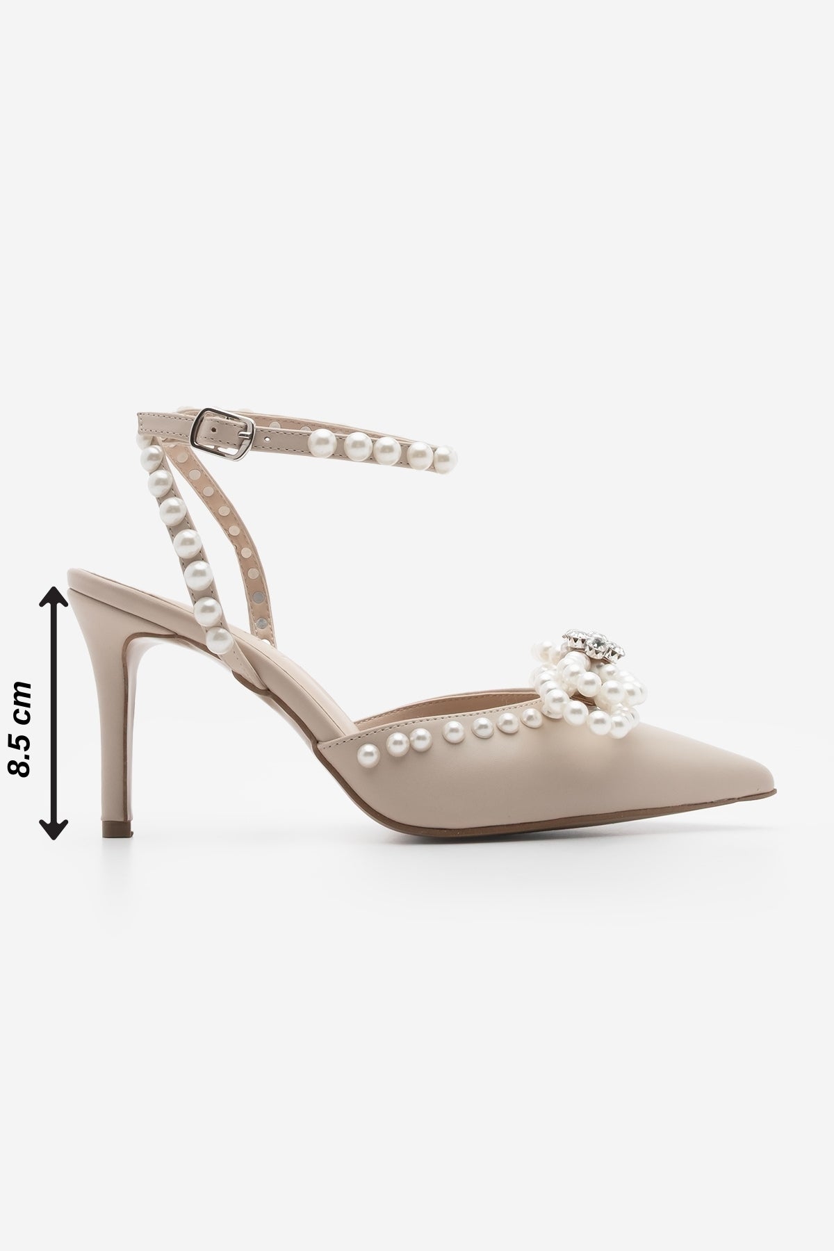 Kadın Stiletto İncili Taşlı Topuklu Ayakkabı Robis - Bej