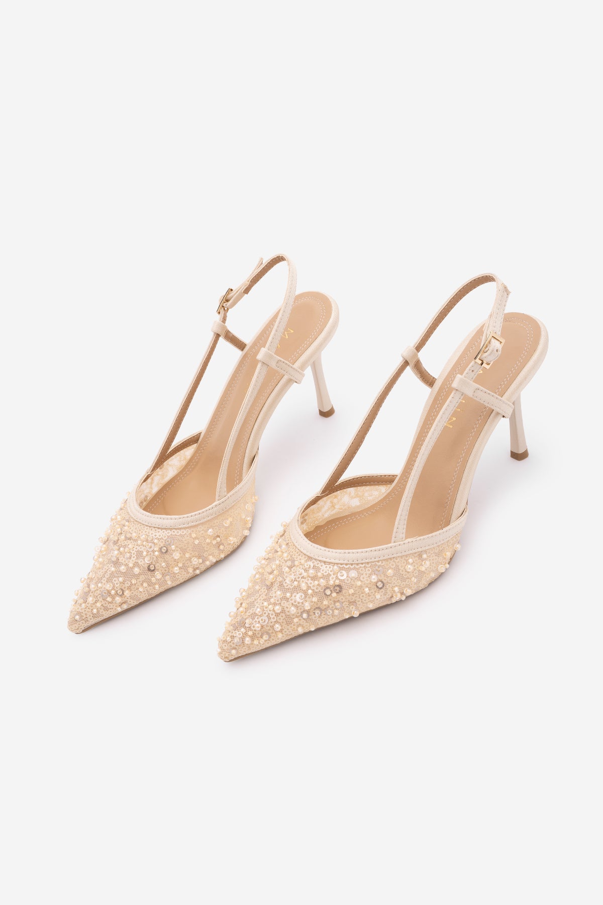 Kadın Stiletto Boncuklu Fileli Klasik Topuklu Ayakkabı Mozila - Bej Saten