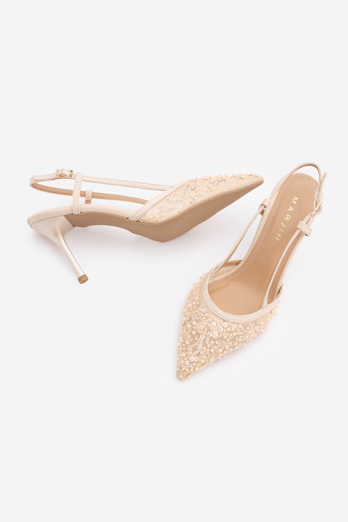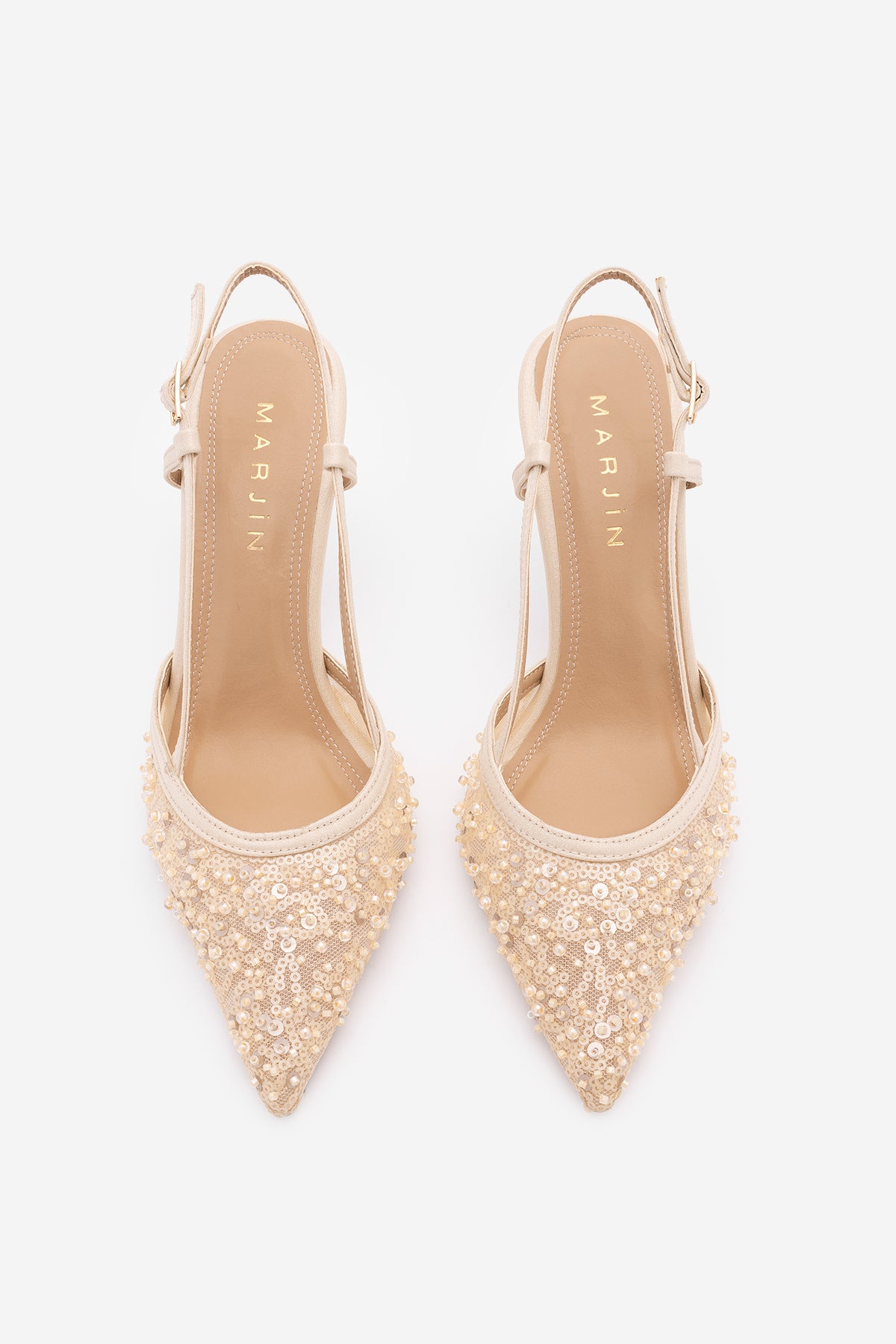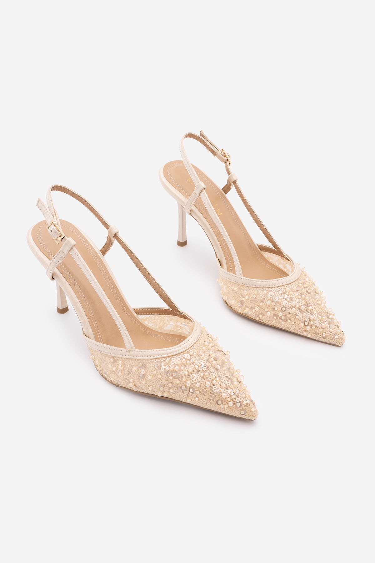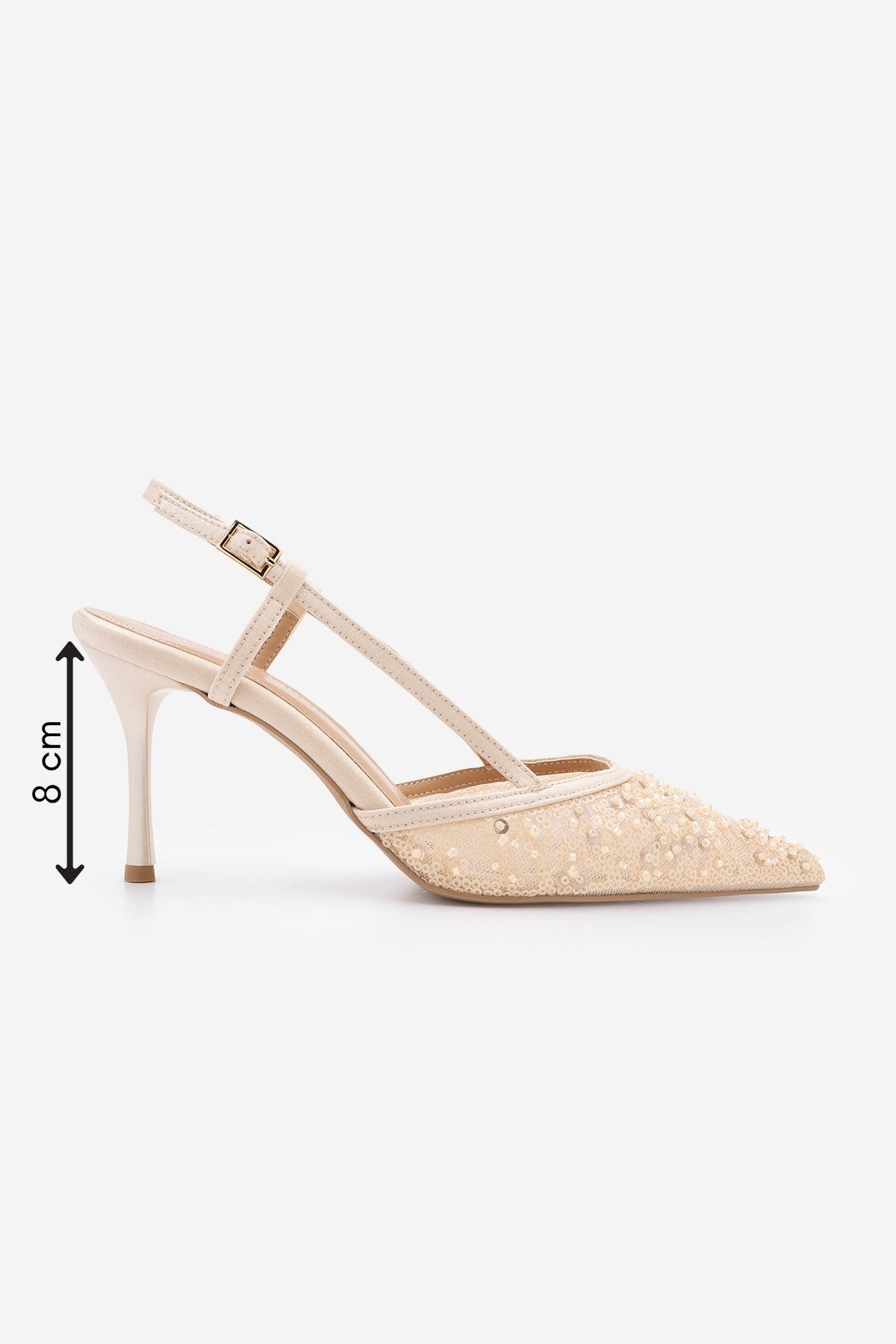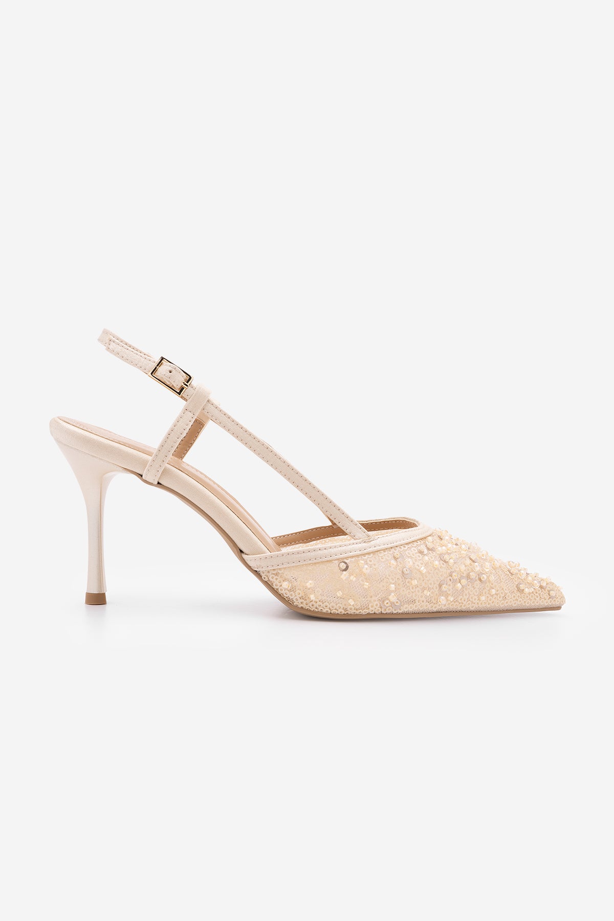 Kadın Stiletto Pullu Boncuklu Fileli Klasik Topuklu Ayakkabı Daruka - Bej Saten