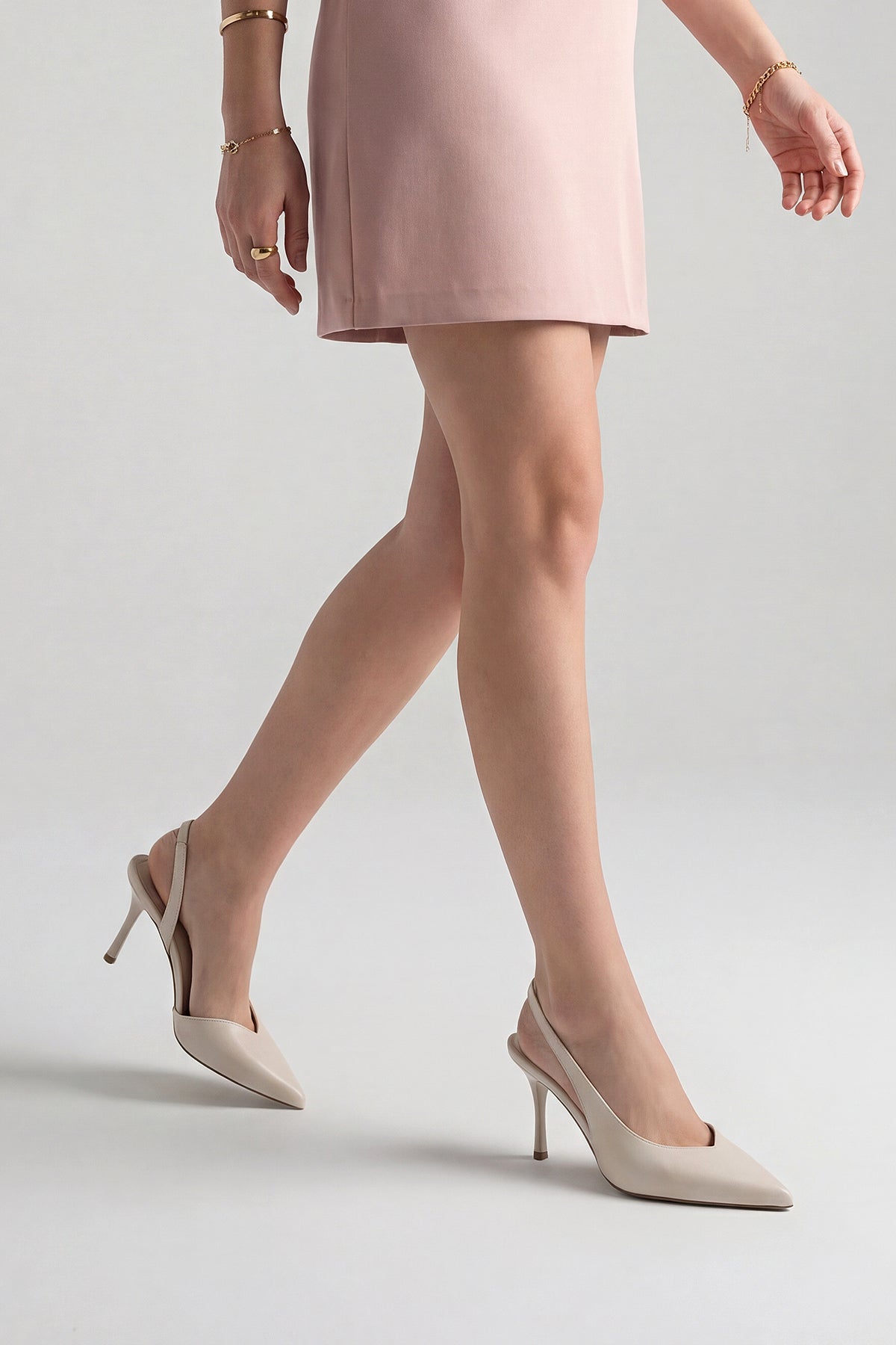 Kadın Sivri Burun Bantlı İnce Topuklu Sandalet Lokes - Bej Saten