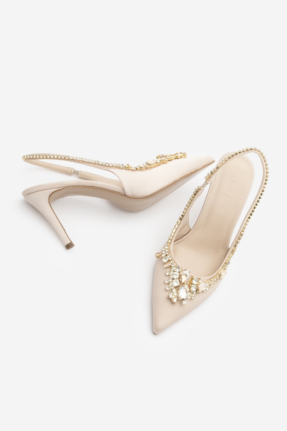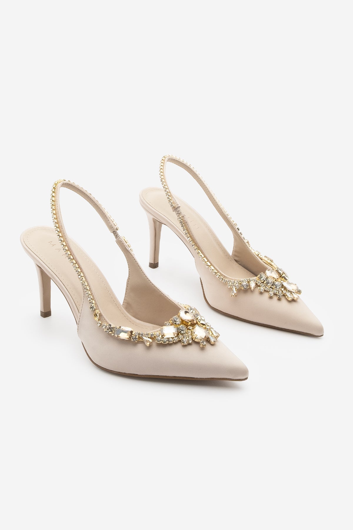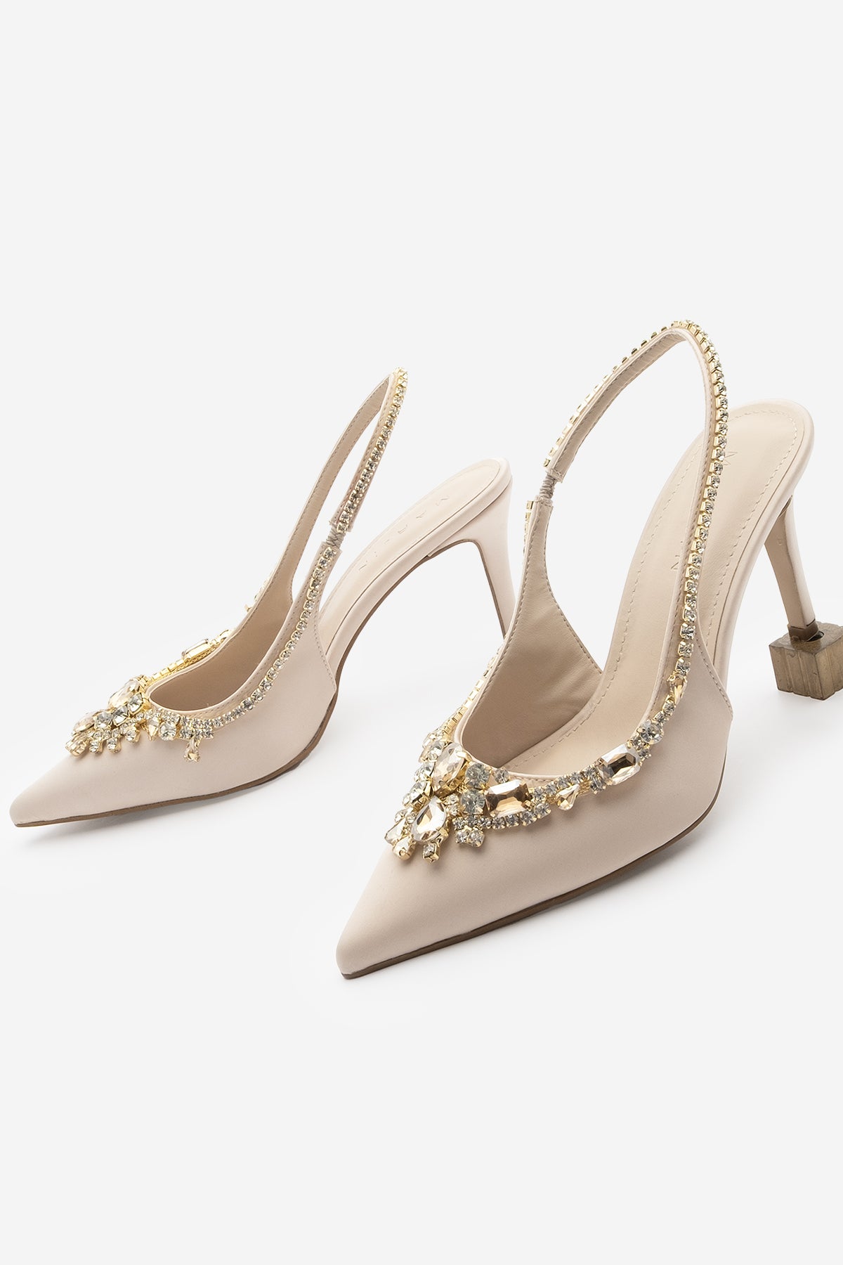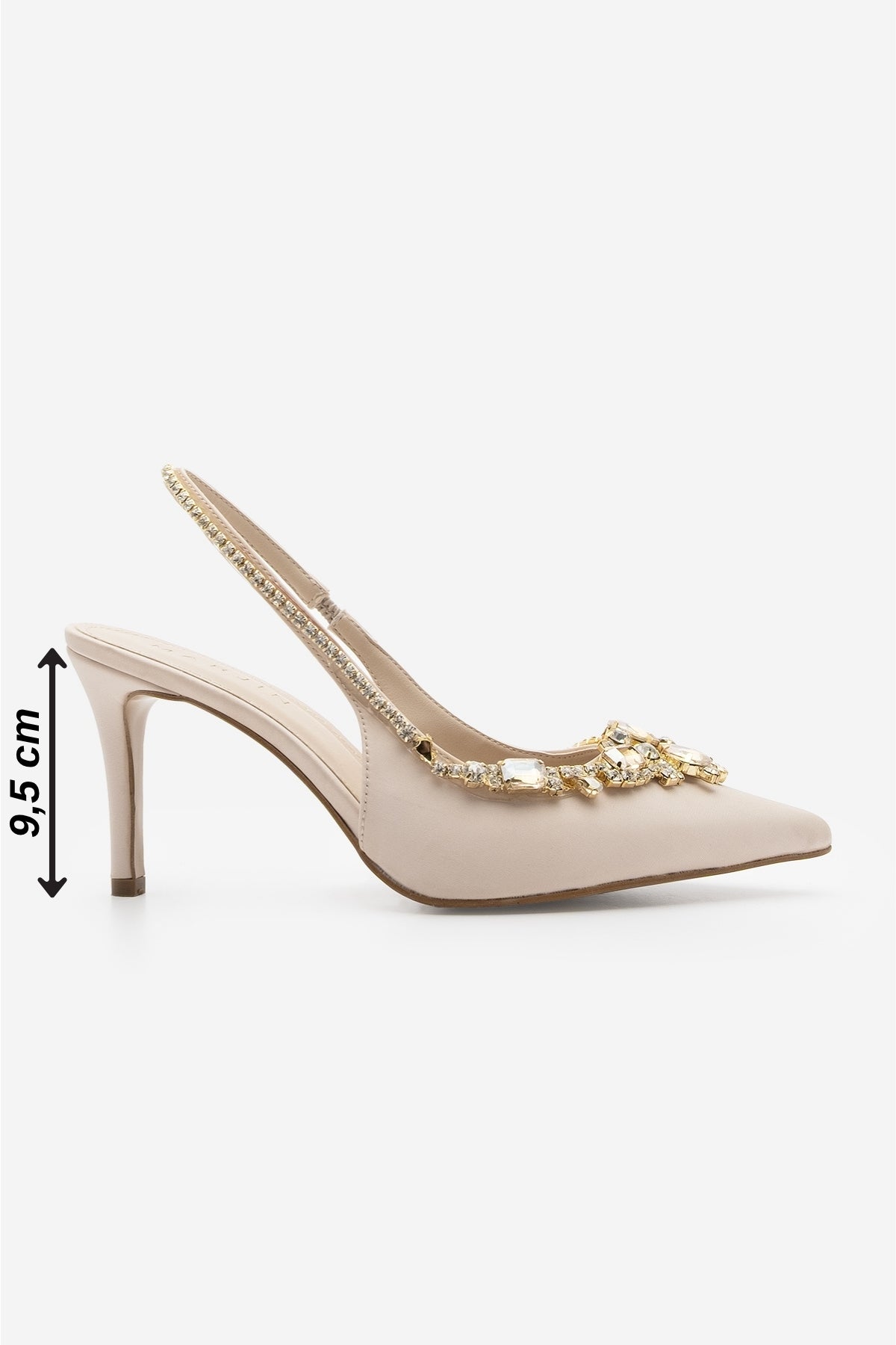 Kadın Stiletto Taşlı Topuklu Ayakkabı Sakne - Bej Saten