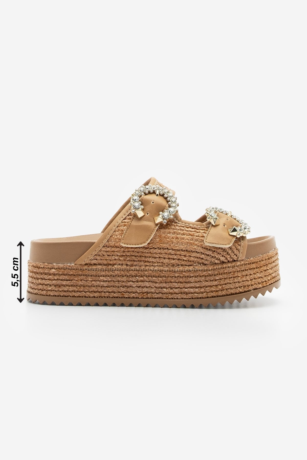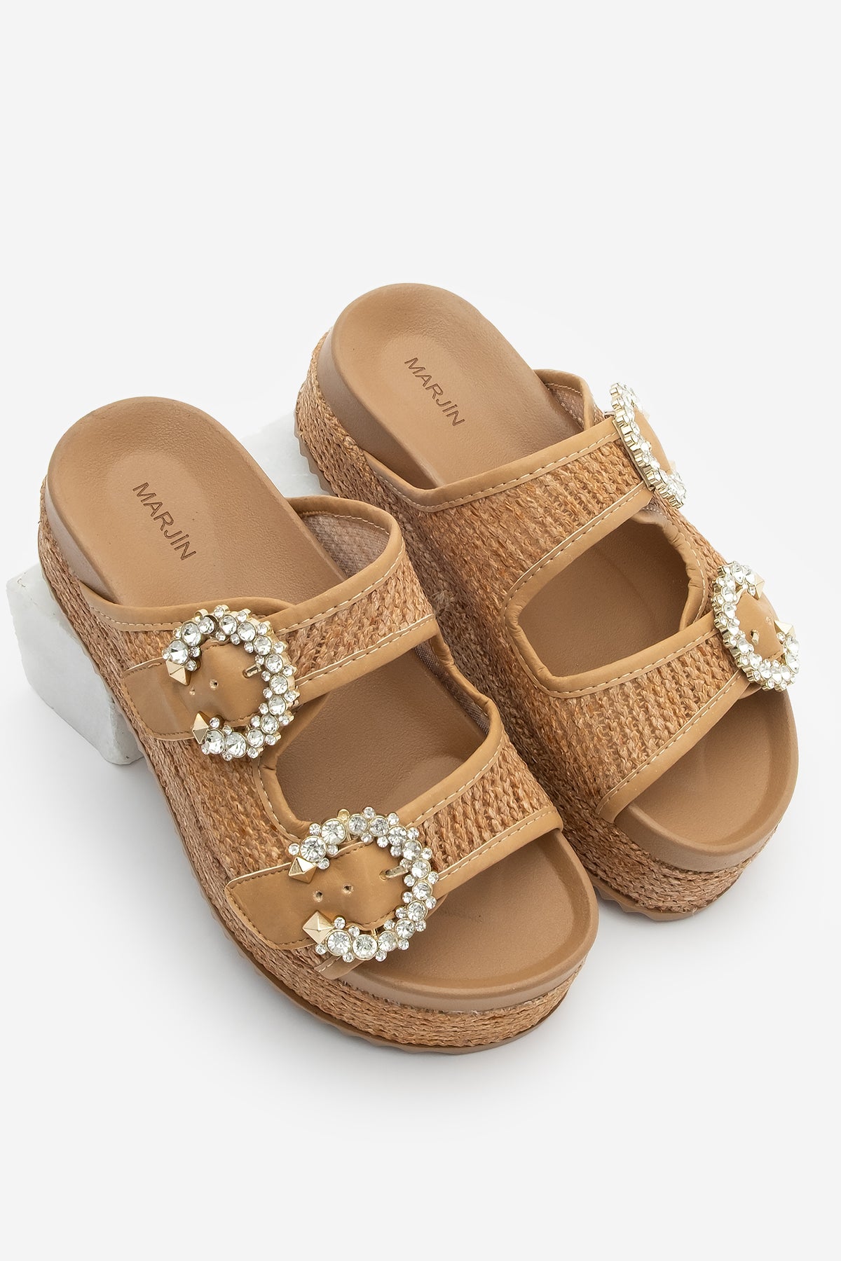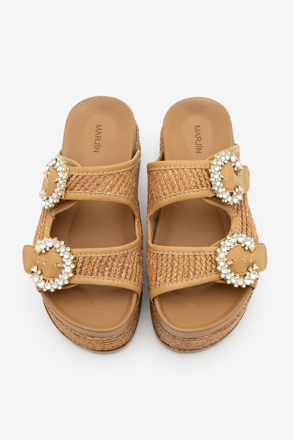 Kadın Taşlı Hasır Günlük Terlik Fivora - Taba Hasır