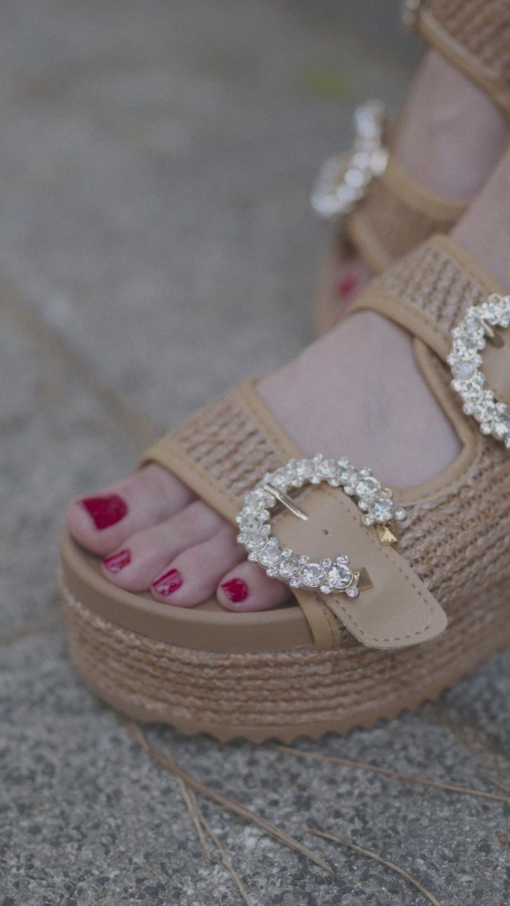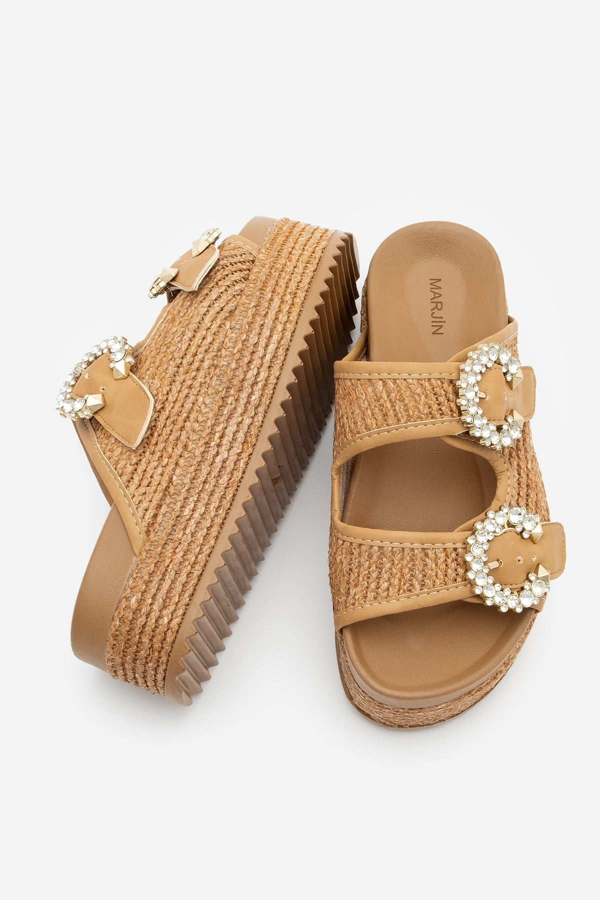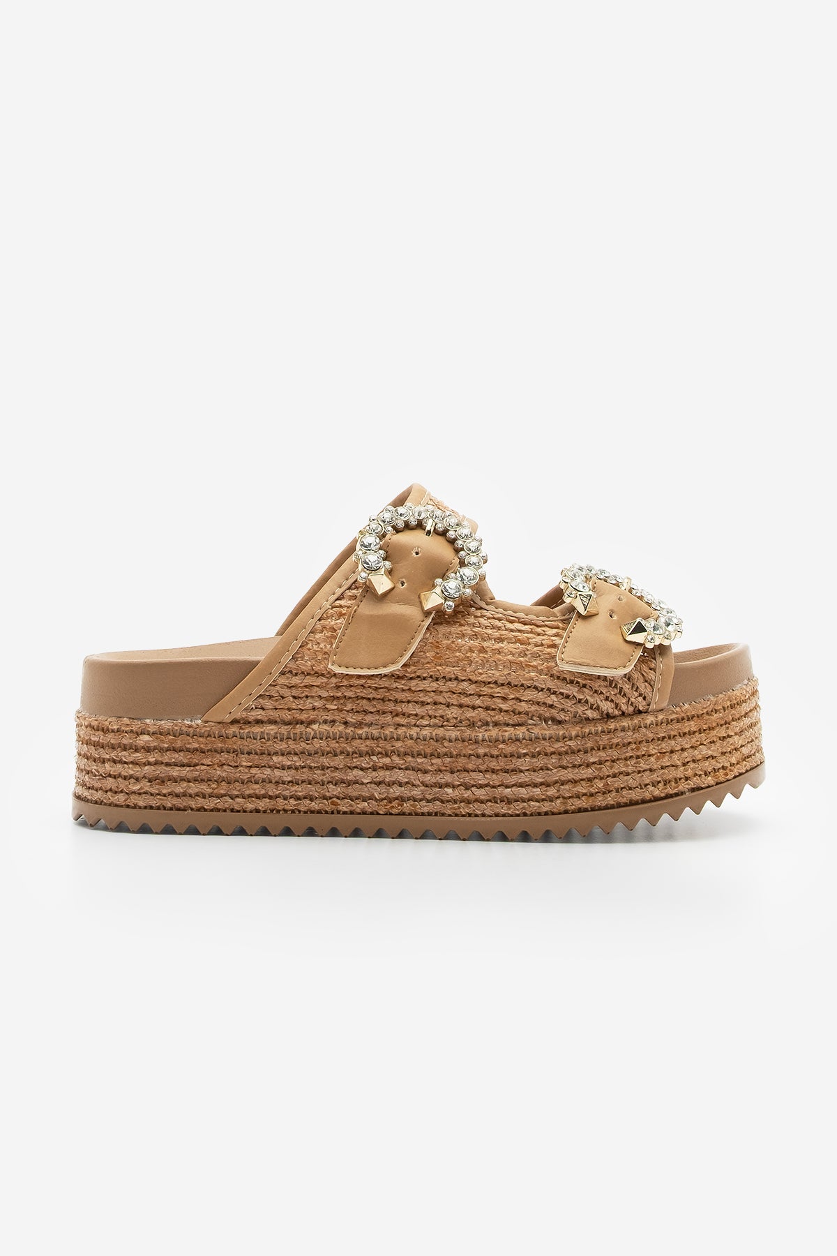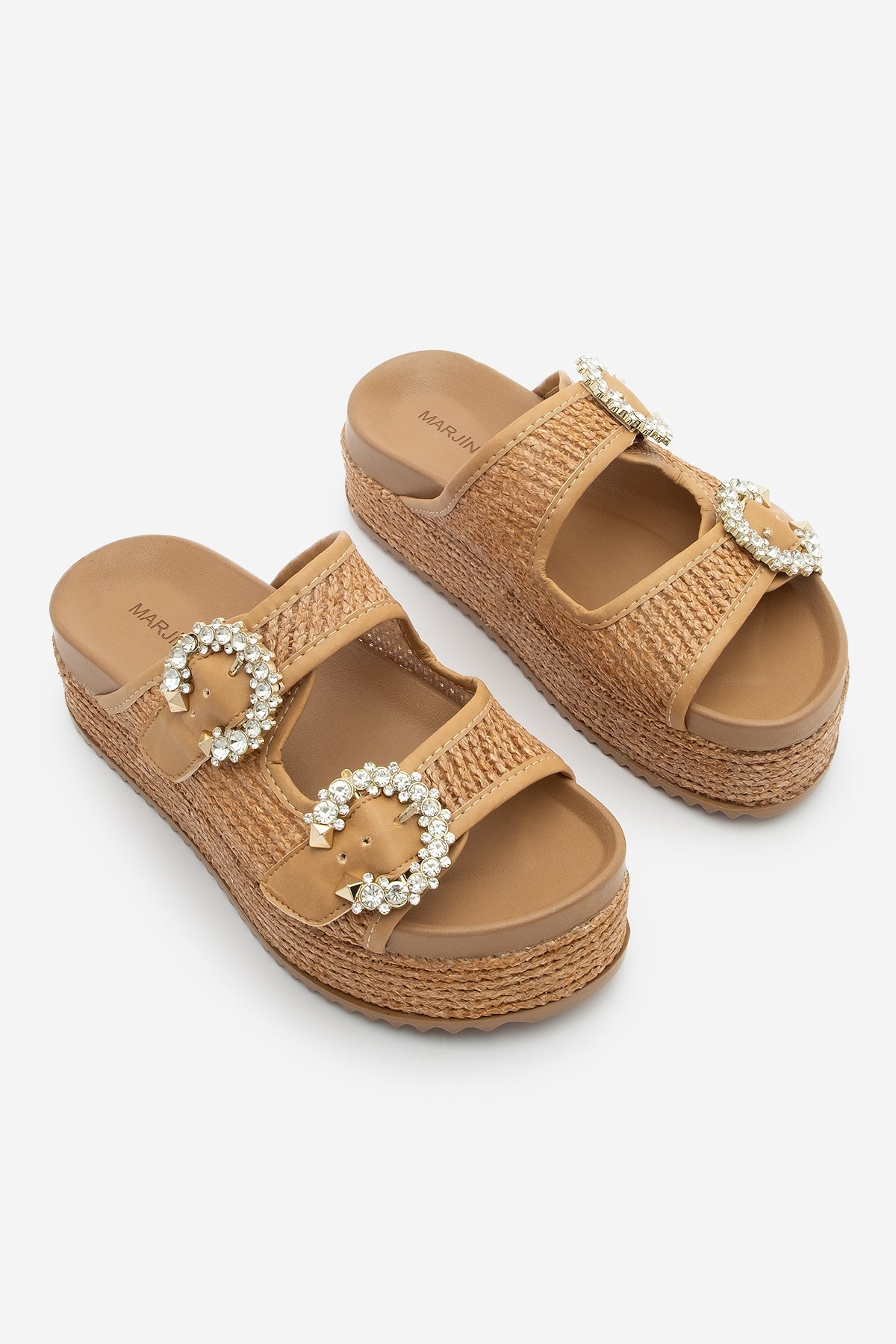 Kadın Taşlı Hasır Günlük Terlik Fivora - Taba Hasır
